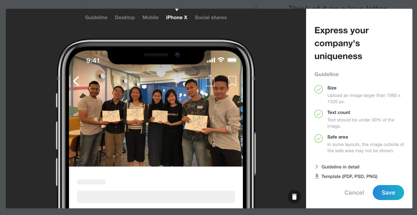 When inserting text in the cover image, please orient it so it fits in the ‘safe area’. By doing this, you can prevent issues such as the cover image being displayed attractively on Wantedly but in Facebook shares, some of the text is cut off. You can download the guide for the safe area and image size (PSD / PNG / PDF) from here and utilize it when designing your image.