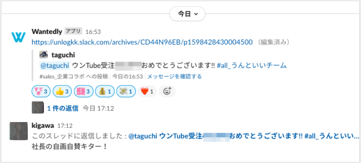 一般的に社長や経営陣に面と向かって「あの行動良かったですよ!」とは言いづらいですよね。でも、褒められると誰でも嬉しいですし、経営メンバーも褒められたがっていると思うんです。そういえば、チャットを見た代表が「僕も褒めてほしい」って言ってましたよ(笑)。