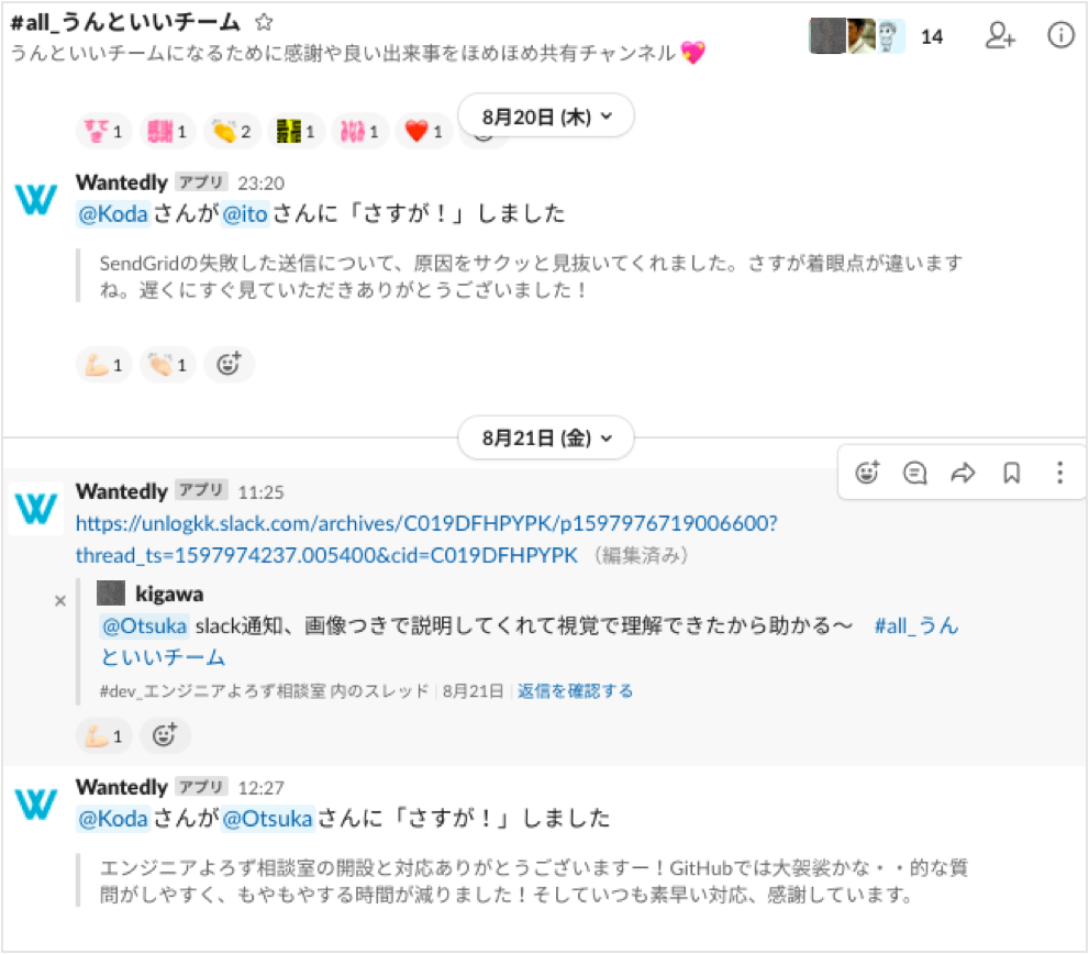 以前は議事録がその役割を担っていましたが、ウンログは一人でプロジェクトを回すことも多く、議事録が共有されないこともあります。Slackチャンネルを見れば「〇〇をすればチームに貢献できる」と直感的に知ることができる。メンバー増加に伴って育成が必要なジュニア世代も増えたので、この機能はすごく役に立っています。