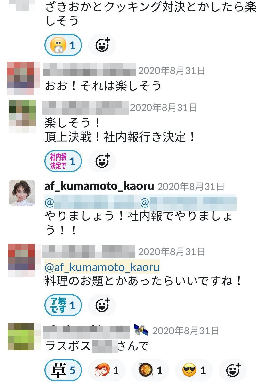 熊本:まさにそうなんです。自由帳でのイベントややりとりを、社内報で取り上げようと思っています。Storyの社内報ができた日に、Slackで「社内報決定で」というスタンプを作ったんです。社内報に載せたいと思った会話に片っ端から「社内報決定で」と押していたら、それに賛同してくれる人も出てきたので、社内報というワードとの接触頻度を増やして、社内報に対するモチベーションを高められるよう地道にやっています。