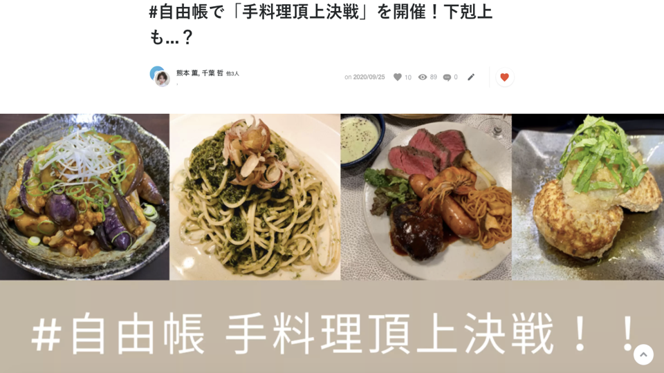 「自由帳」には、仕事中に聴いている曲や、その時々の天候に合わせたお薦めの曲を紹介する元バンドマンが現れたり、今日作った晩ご飯を「#ずぼら自炊日記」や「#夕食」とタグを付けて毎日公開する若い社員が出てきたり、自然と面白い使い方が生まれてきました。最近では「料理の頂上決戦」なんていうのもあります。毎晩、アップされた料理写真についたメダルで点数を競うんです。Slackのスタンプで金銀銅メダルを作り、金メダルが3点、銀が2点、銅が1点というルールで。先日はその最終戦で勝ち上がった社員が、料理の得意な取締役との頂上決戦をしていました。ちょうど今、集計中です。