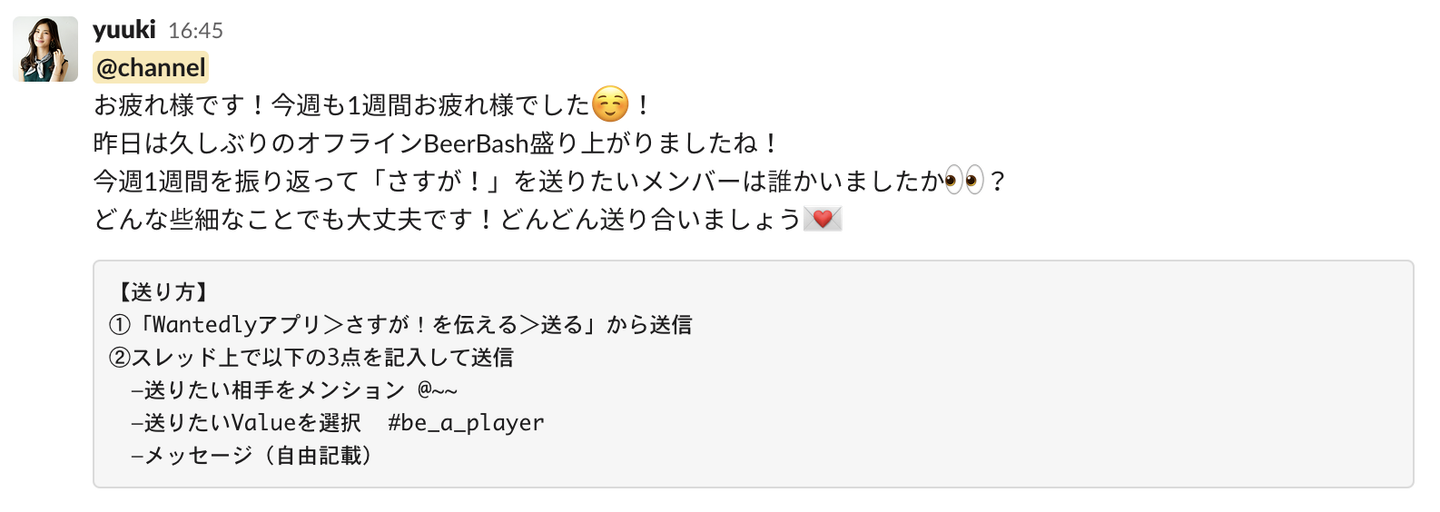 米原:バリューを掲げるだけでは形骸化してしまう恐れがあったので、バリューを体現できているメンバーやアクションに対して「さすが!」を送り合うようにしました。「調子どう?」が送られる毎週金曜日に「さすが!」を送り合って、習慣化するようにしています。バリューの浸透という面ではまだまだ発展途上ですが、バリューに意識を向ける時間を設けることで徐々にバリューが浸透した組織になればと思っています。
