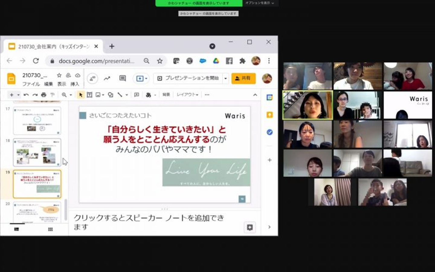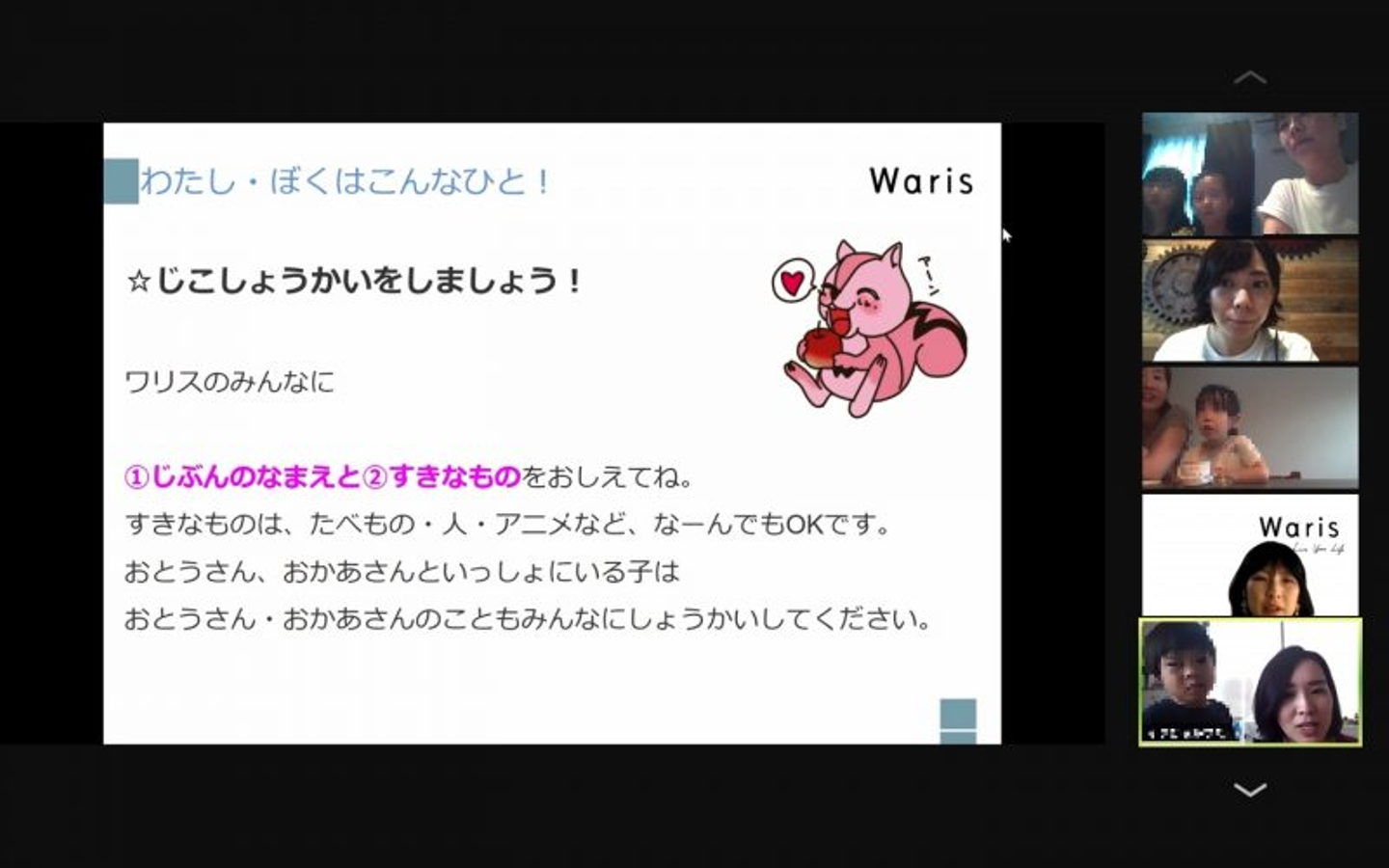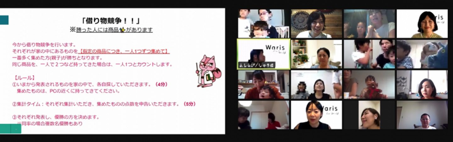 コロナ感染症拡大が広がる前まではWarisメンバーの家族揃ってバーベキュー!や、オフィスで子供達にお仕事体験をしてもらう!なんてこともあったのですが、昨今の状況から初のオンラインでのイベント開催。