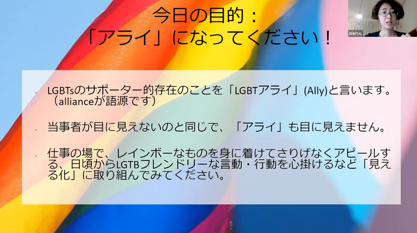 「当事者の存在がなかなか見えないのと同じように、アライの存在も見えにくいです。今日のミーティングが、皆さんが行動するきっかけになればうれしいです」(かおりん)