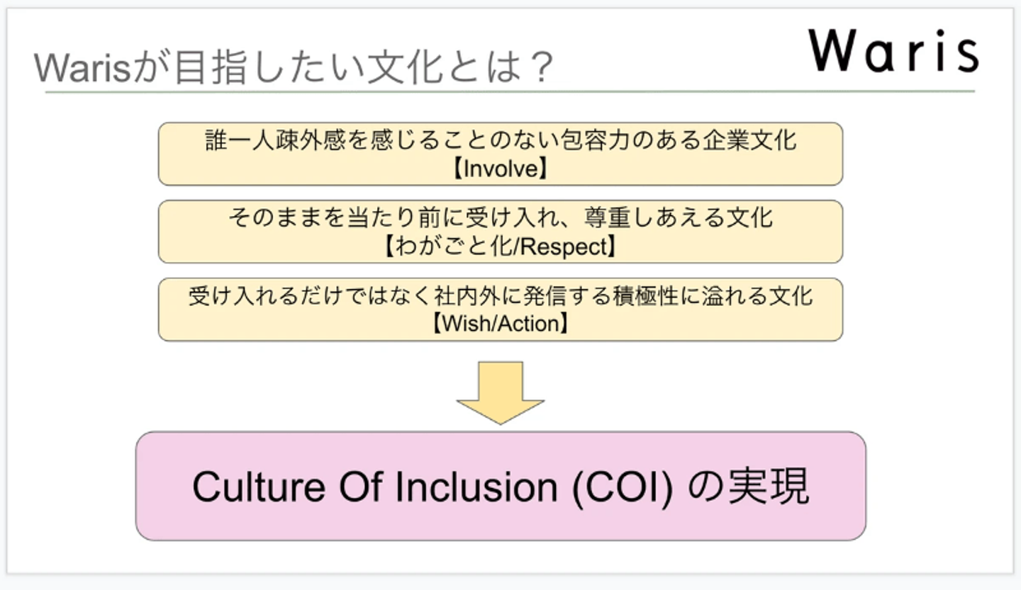 ひろえ:かおりんが研修をしてくれたことで、メンバーにとっても「多様な人たちを受け入れたい」という意志を確認するいいきっかけになりました。最近はWarisにも、男性や海外に住んでいる方、新卒のメンバーなど、多様な人材がジョインしてくれているところです。人間なので、今までと違うことへの戸惑いも当然起こってくるのですが、新しい価値観を取り入れることで、組織はより強くなっていけるとひしひし感じています。