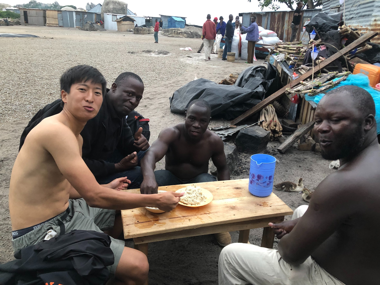 【写真】ビクトリア湖に浮かぶ島で漁師とウガリをたべる写真。背景は一面のダガー(さかな)。