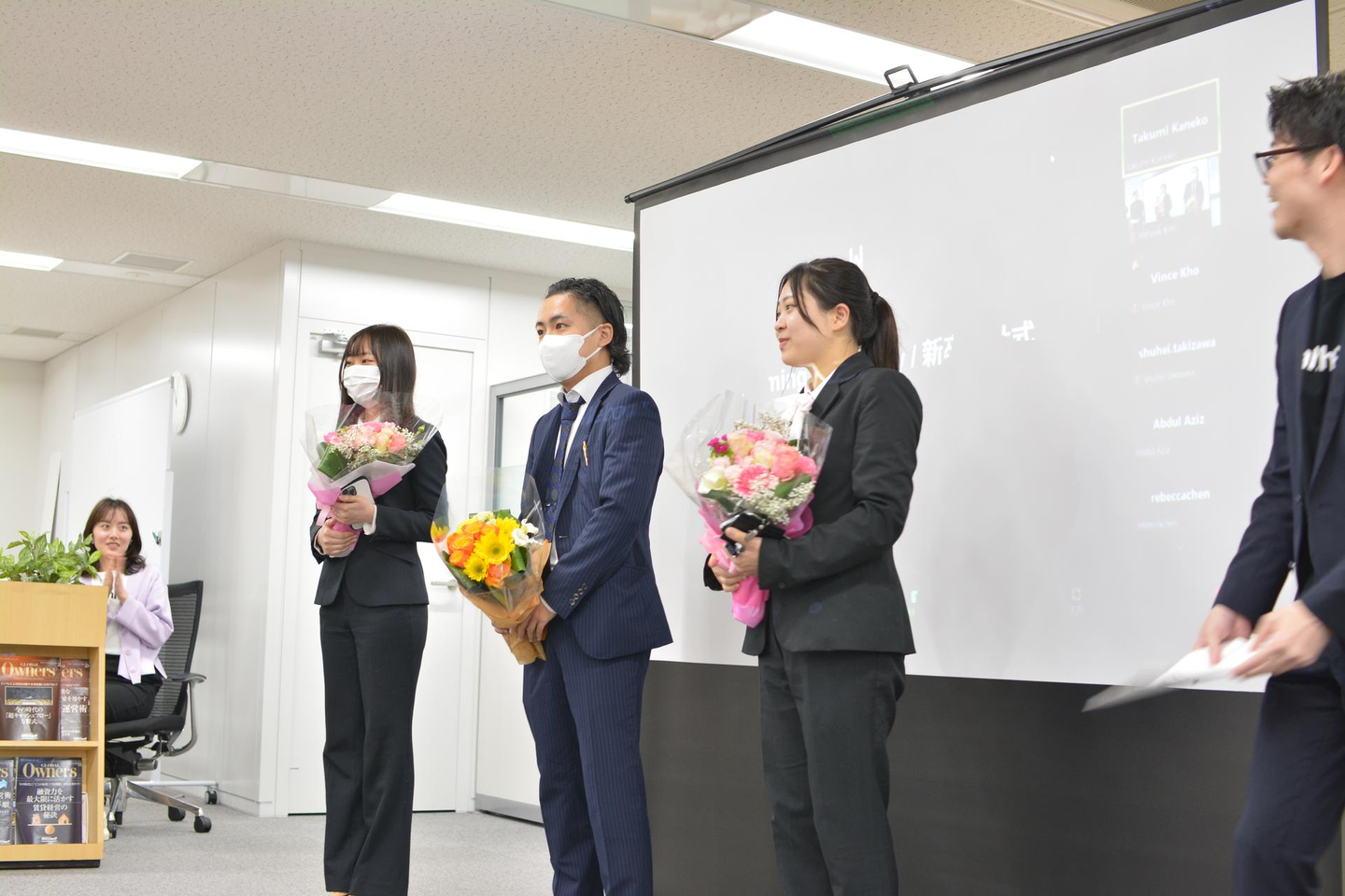 続いて3名の新入社員から自己紹介となりました。太田さんは帰国子女ということもあり、非常に流暢な英語でのスピーチ。黒田さんは初々しさを残しつつしっかりと決意表明を。呂さんは会場にポジティブな雰囲気を与えてくれました。