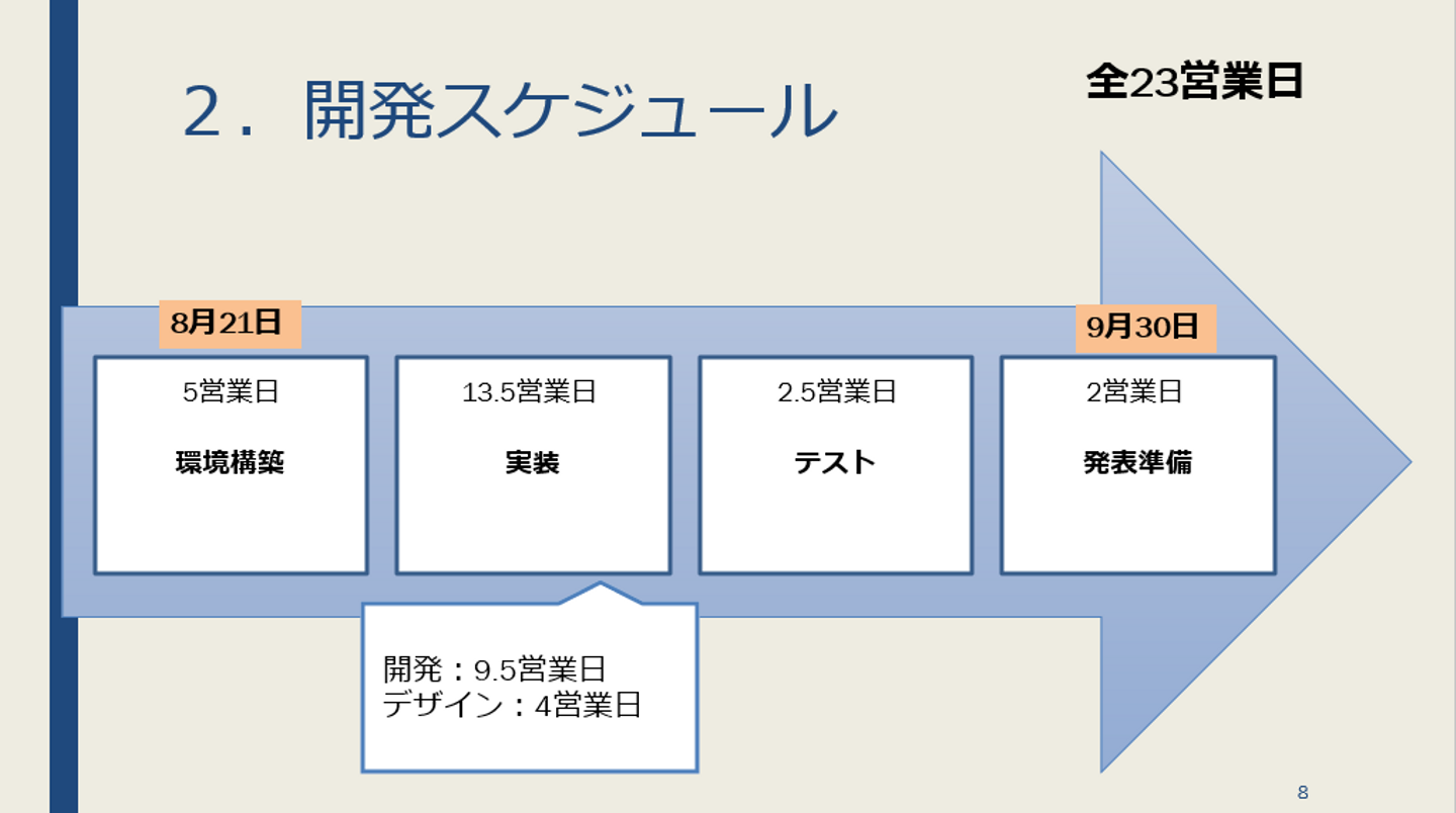 →まずはSQLを覚えるため、基本的な文法、テーブルを学び、残りの3日でKaggleを使用し、機械学習を学びました。最後は学んだことを先輩へ発表。