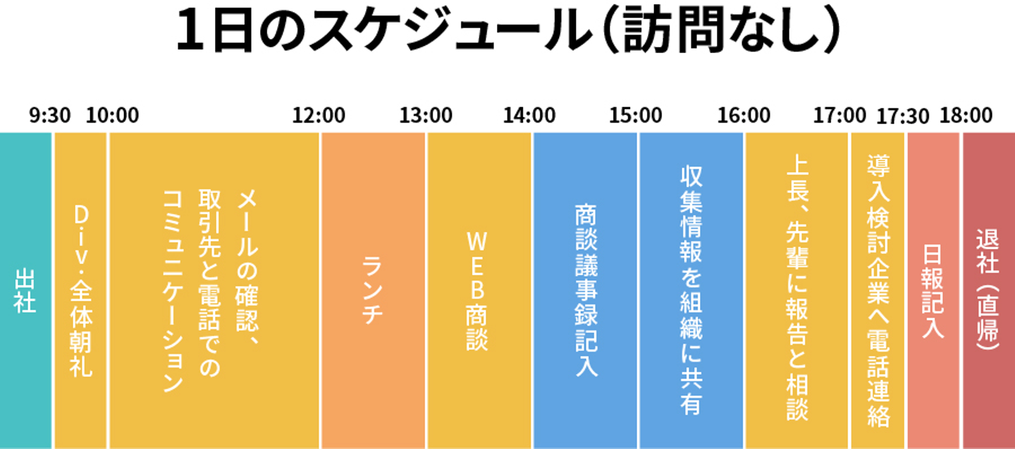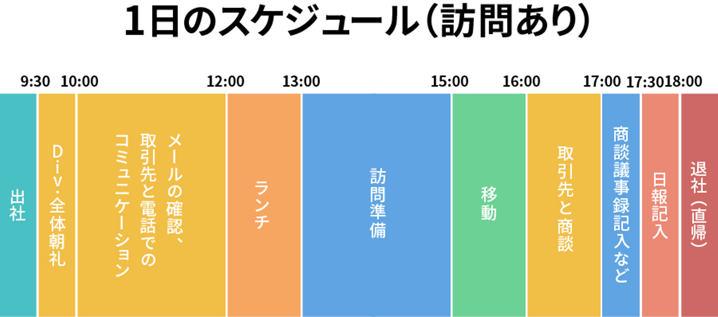 ▼18時:退社 ※夕方近くに訪問の場合は、会社に戻らず、直接帰宅します。