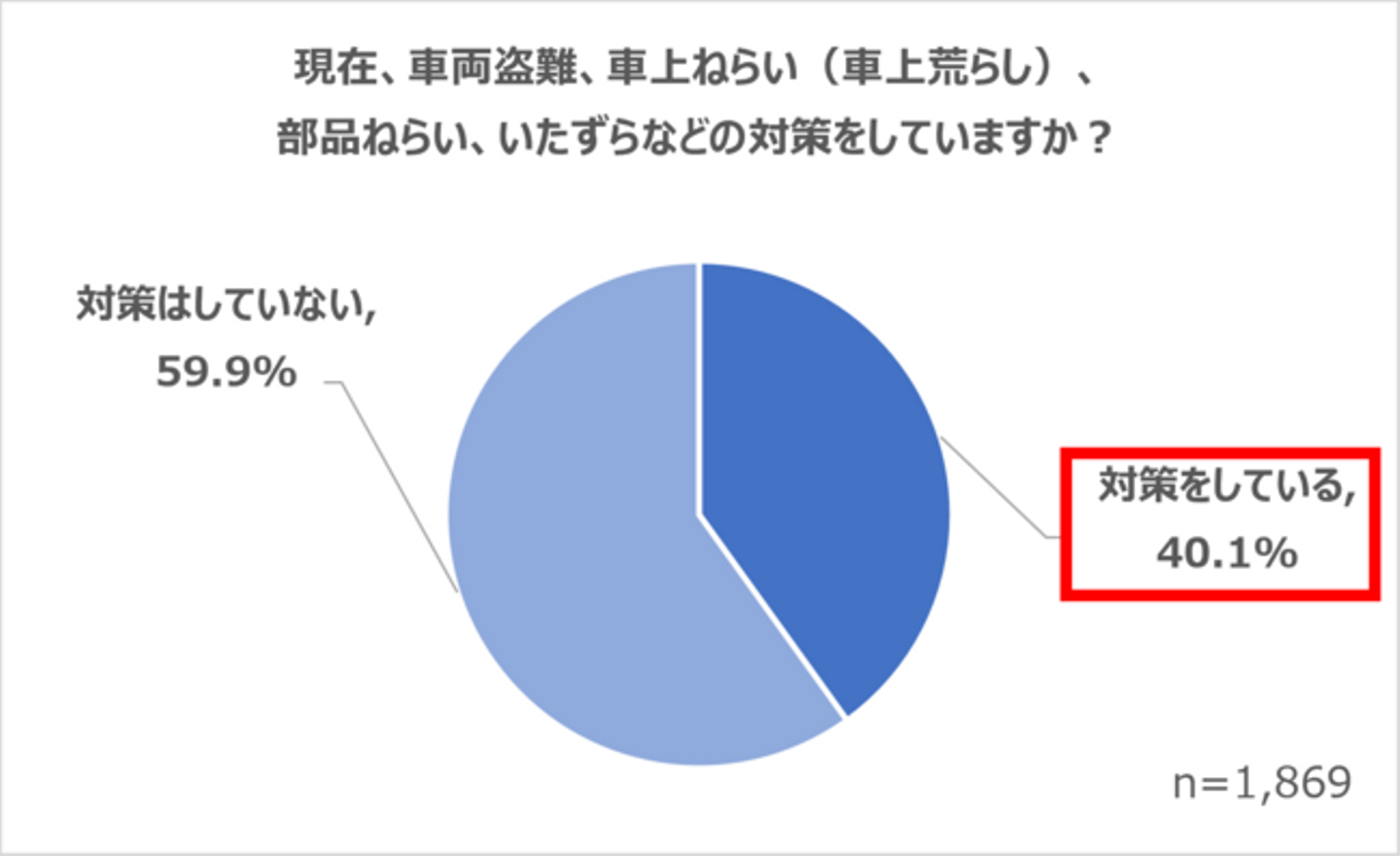 車を所有している1,869人のうち、現在、車両盗難、車上ねらい(車上荒らし)、部品ねらい、いたずらなどの「対策をしている」と回答した人は40.1%と、対策をしている方の方が少ない結果に。