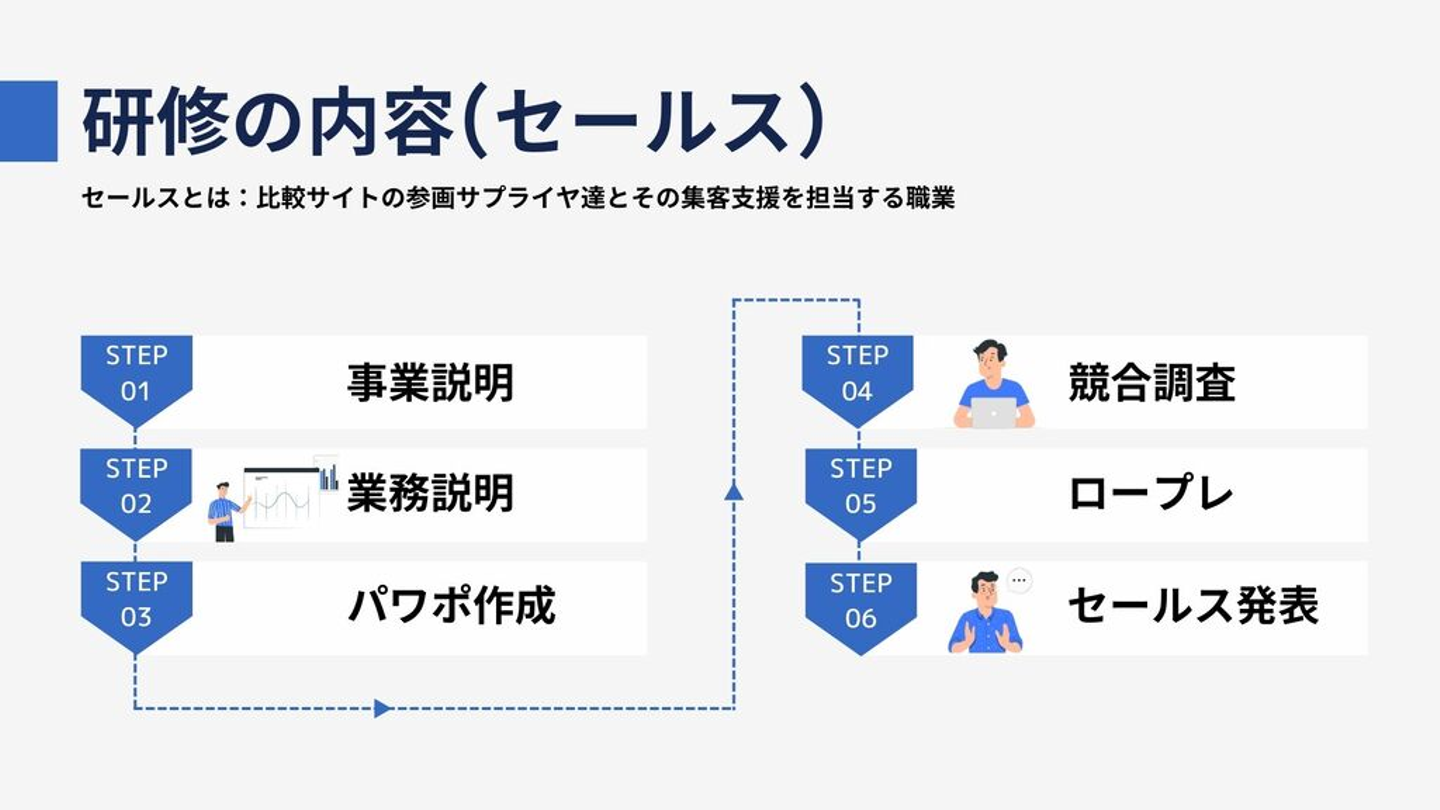 入社してから初めての職種研修がセールス研修でした。サプライヤ(法人企業)へ新規営業を商談をするという設定のもと、提案資料の作成と模擬商談を行いました。新卒3人がそれぞれ違う事業を担当し、色んな社員に協力をしてもらいながら、ロープレ(商談練習)を繰り返し改善していきました。最終日には事業責任者であるリーダーたち3人が見ている中で、メンターを相手に模擬商談を行いました!