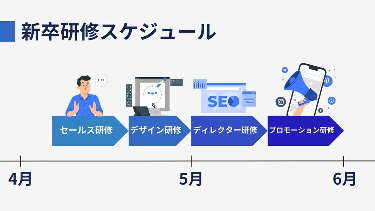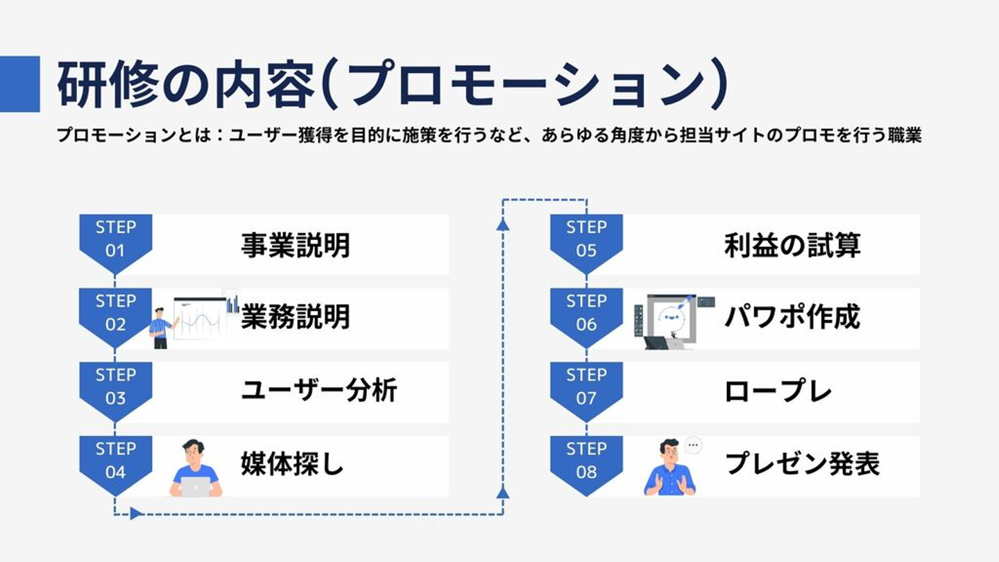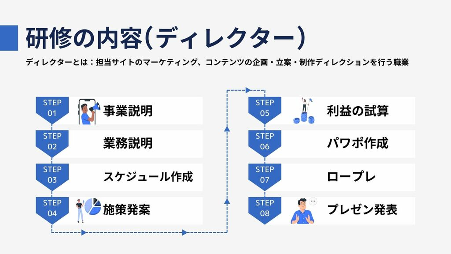 今回はその2か月の中でも自由度が高く、それぞれ約7営業日に渡って行われた「セールス」「ディレクター」「プロモーション」の研修について詳しくお伝えします!
