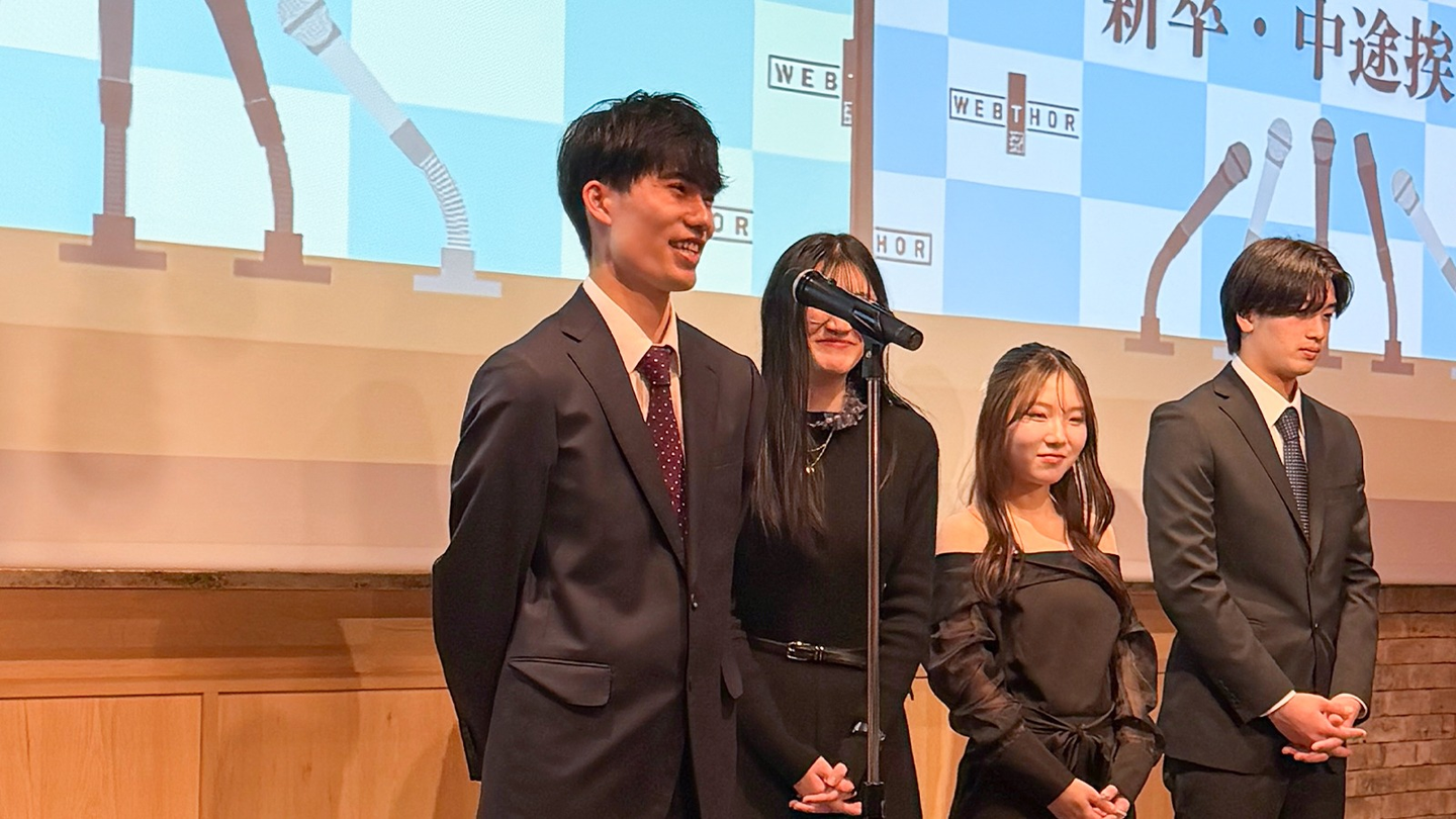 ↓緊張しながらも全社の前で、自己紹介をする26卒の様子