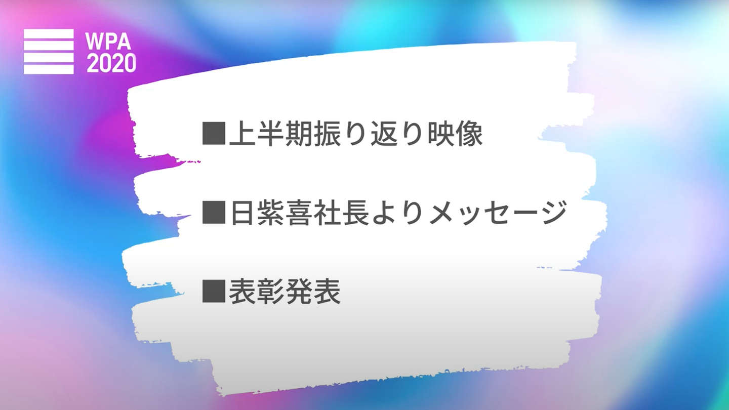 「WPA2020」の内容は、①半期の振り返り、②代表取締役社長 日紫喜からのメッセージ、③表彰者の発表の3つです。