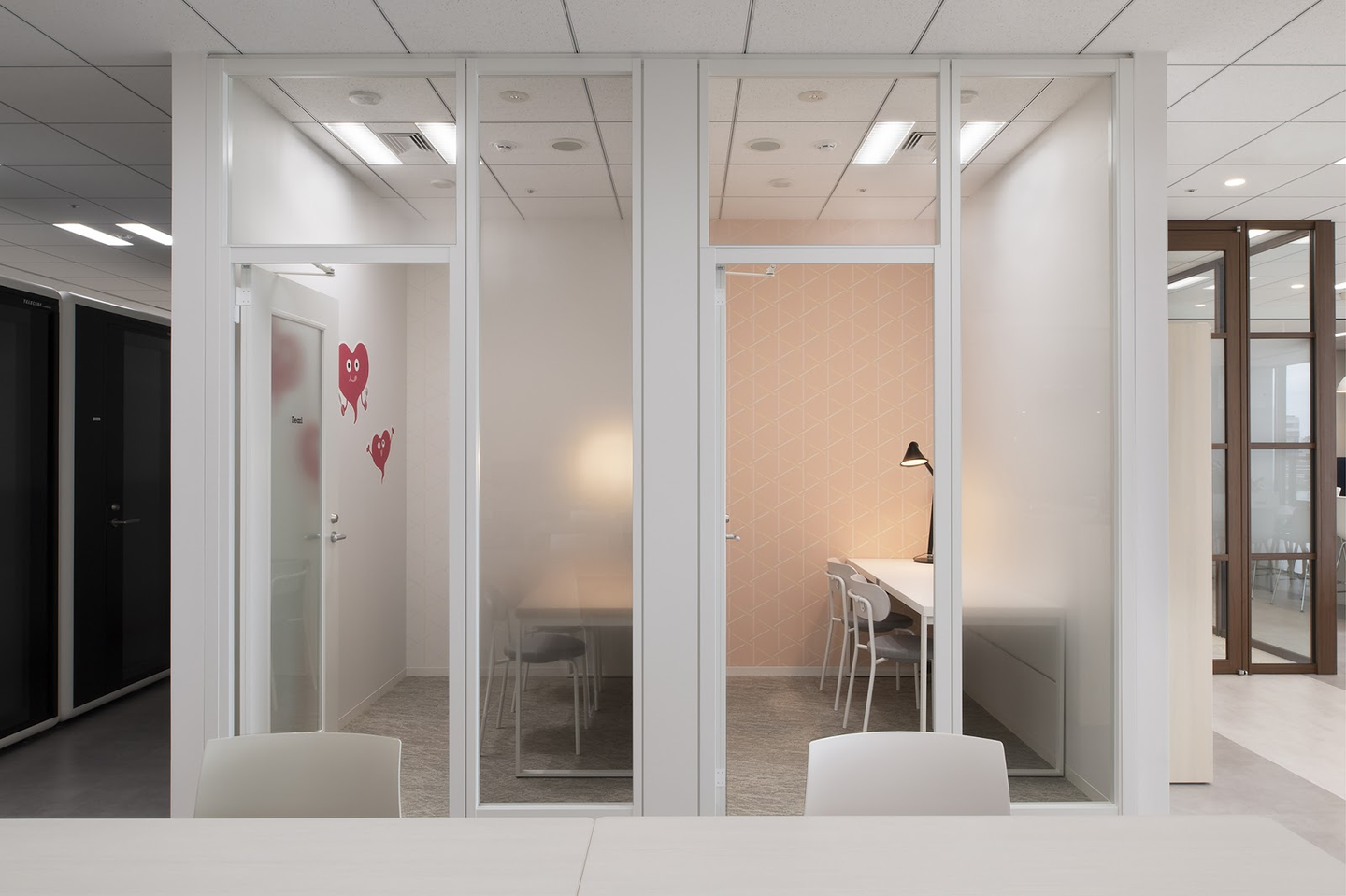 Webミーティングや1on1などで使えるミーティングルームも増えました。左奥に見えるのはWebミーティング専用のブース。