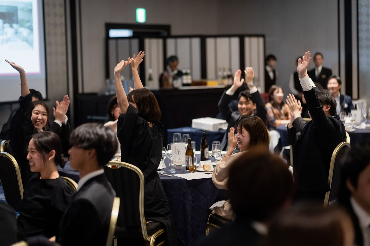懇親会中は、部署や職種などをシャッフルした座席に座り、垣根を越えたコミュニケーションを。(オンライン参加メンバーはZoomにて歓談を楽しみます)コンセプトをもとにしたコンテンツから、来年仲間になる内定者との交流がとれるコンテンツまで。この半期を労いながら、次の半期へさらにチームウエディングパークを感じられる懇親会となりました。