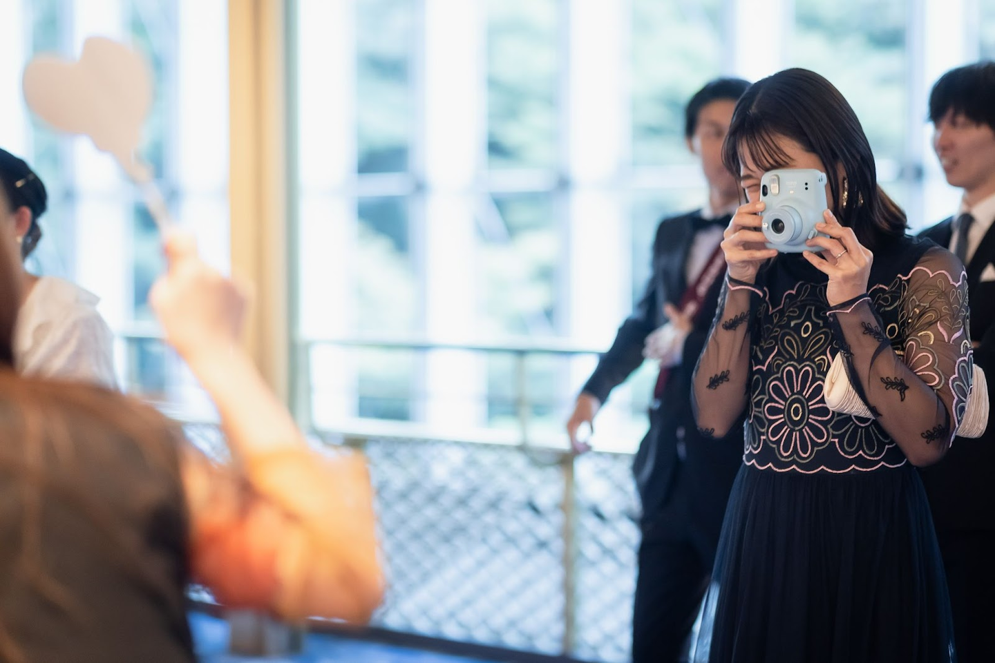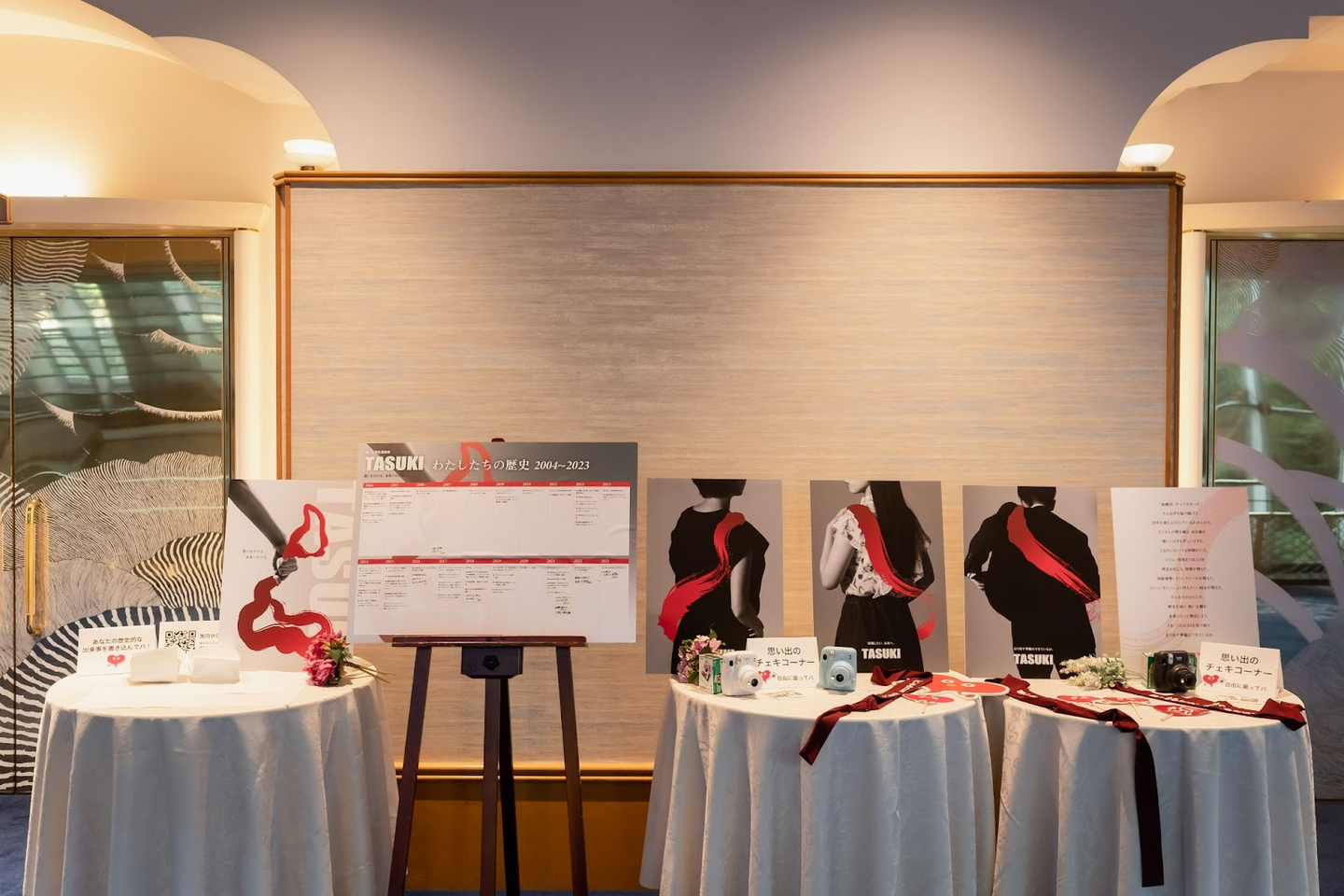 ホワイエにはチェキコーナーや、ウエディングパークの歴史を社員が書き込めるパネルを用意し、表彰式までそれぞれ仲間と楽しみながら過ごせる工夫も。