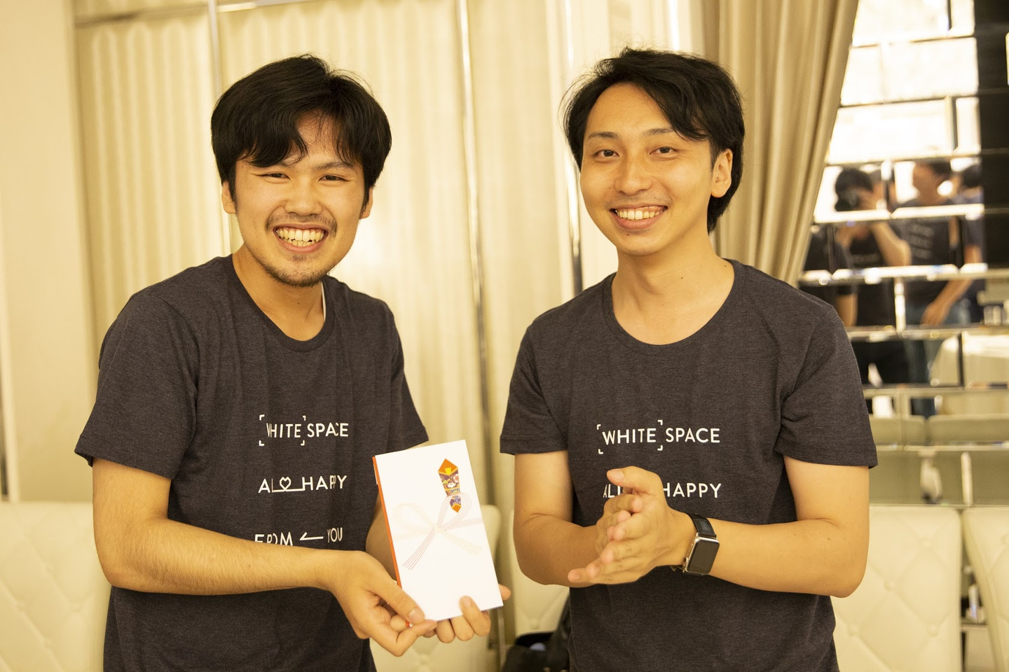 (写真:今年7月に実施されたホワイトプラスの9周年パーティー時。クイズ大会で優勝して、社長の井下さんからバルミューダの目録をいただいたとき)