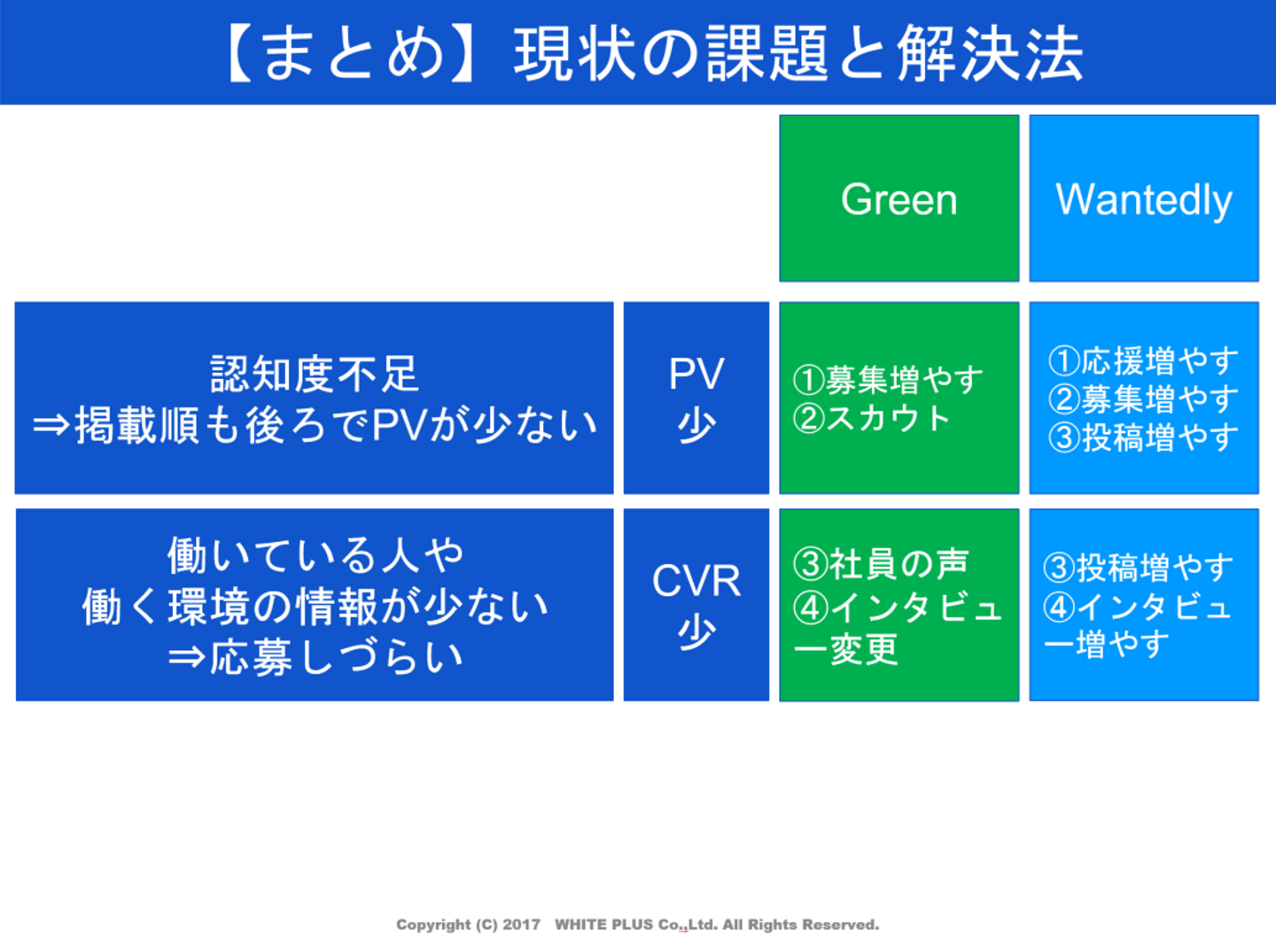 ①Green…PV:募集を増やす、スカウト/CVR:社員の声、求人内容の見直し