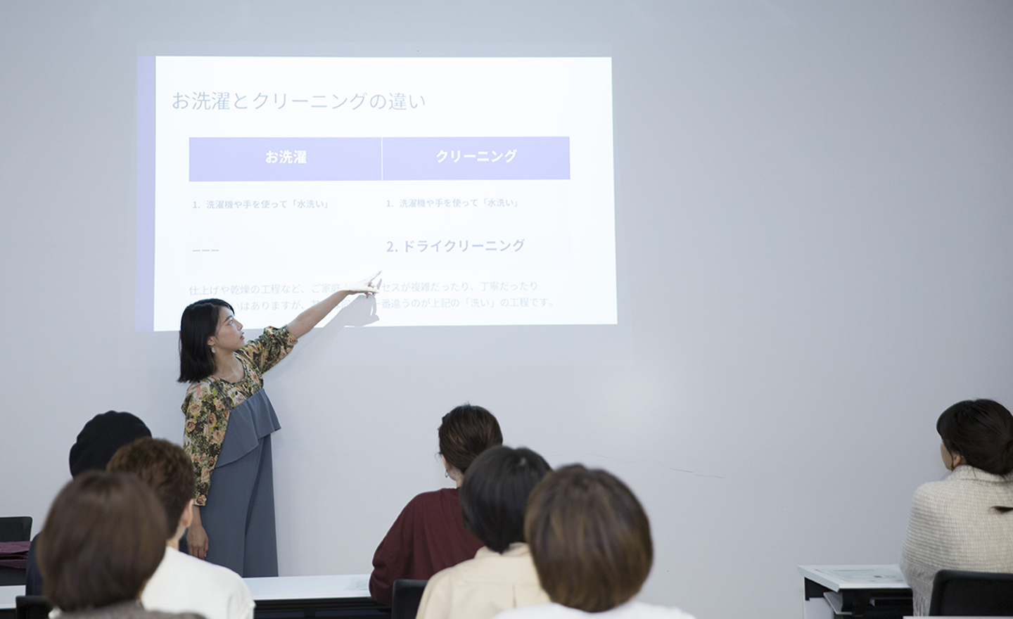 店頭接客で役に立つ、ファッションケアの知識を講義しました。
