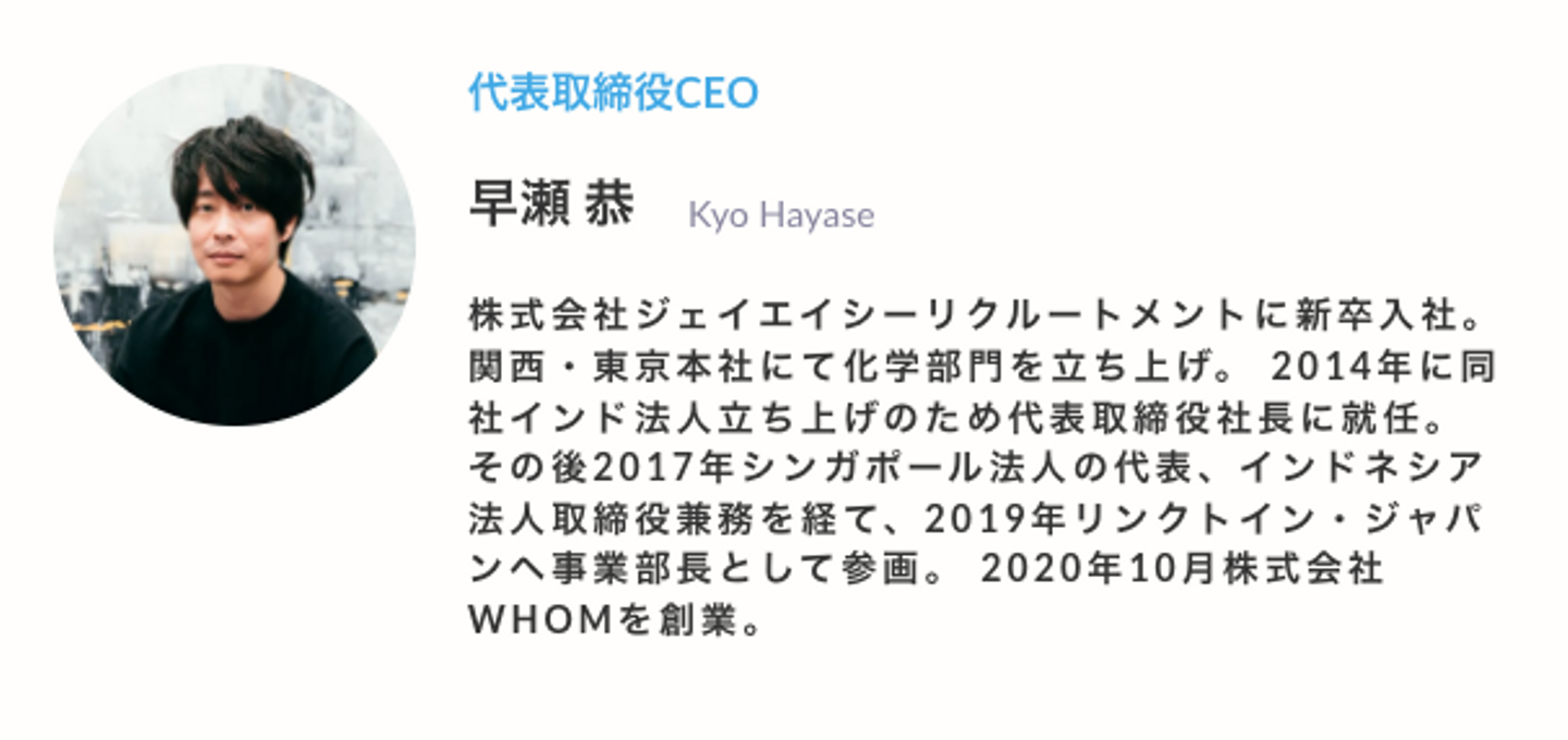 代表の早瀬は大手人材エージェントのJACリクルートメントで海外法人の代表等を経験し、その後LinkedInの事業部長を経験しています。そのためHR業界・人材業界に精通しており、また海外のHR事情に明るいです。HR業界・人材業界の歴史、また日本と海外との比較の観点から業界にひずみを感じWHOMを創業しており、事業面・組織面ともに全体を指揮しています。