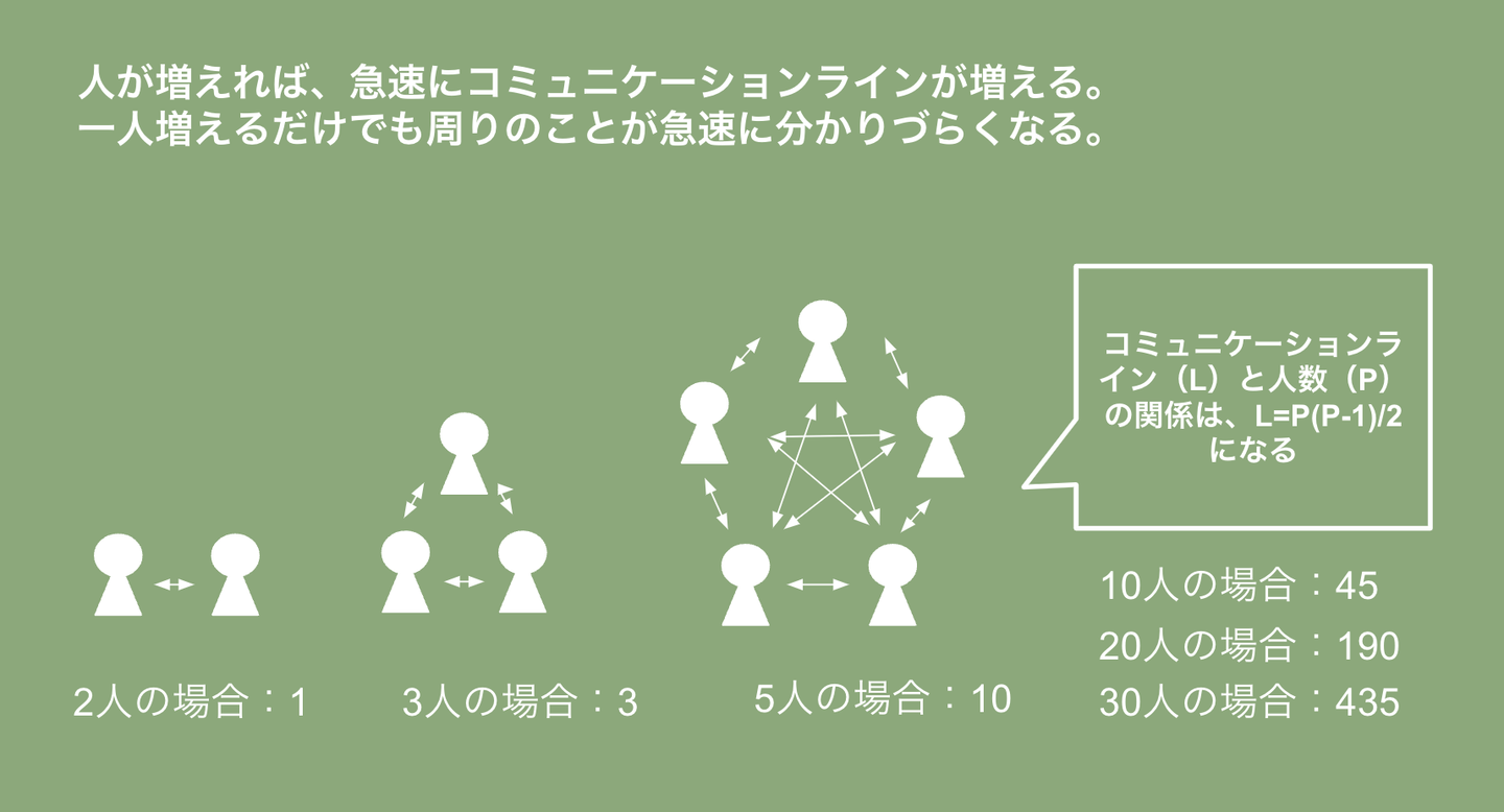 3人の組織ではコミュニケーションラインが3なのに対し、5人に増えればそのライン数は10となり、コミュニケーションライン(L)と人数(P)の関係は、L=P(P-1)/2になるとされています。そのため新しい人が一人増えるだけでもより多くのコミュニケーションラインができてしまい、全員と十分にコミュニケーションをとることが難しくなってしまうということです。人が増えると無意識的に「経営陣(その他特定の人)とのコミュニケーションが減った」「自分のことを理解してくれていないのでは?」といった感覚が芽生えやすくなりますので、オフサイトではこのような構造を理解して相互理解を深めてほしいという想いがあります。