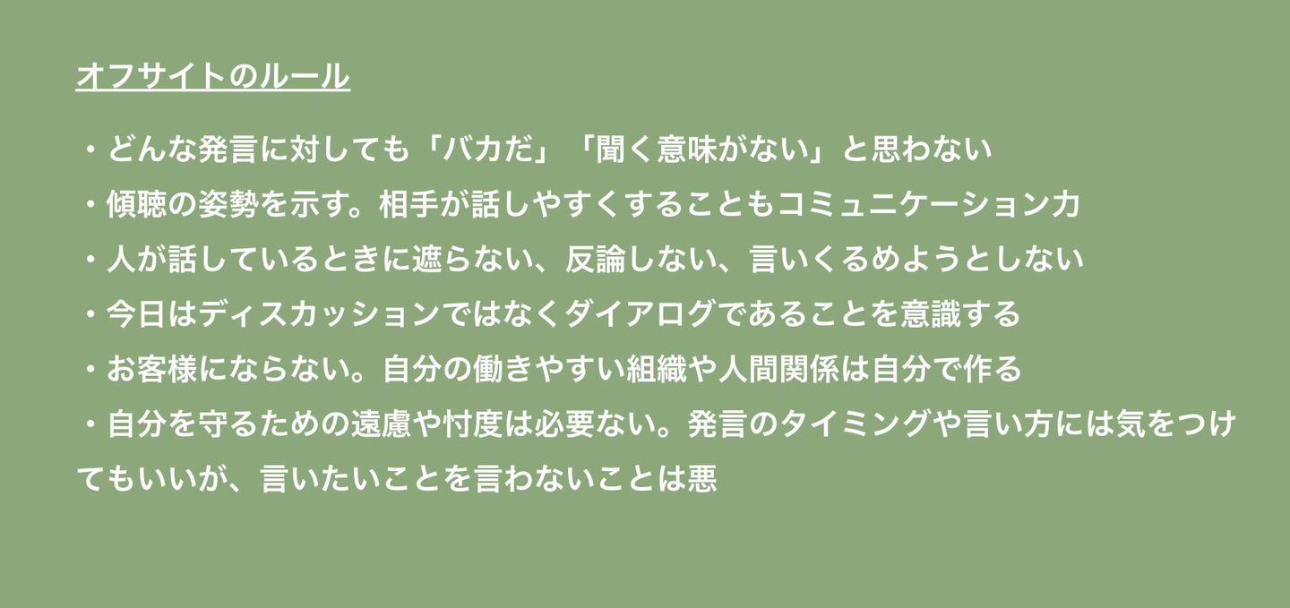こられの考えも踏まえ、今回のオフサイトでは以下の3つの目的の元行いました。