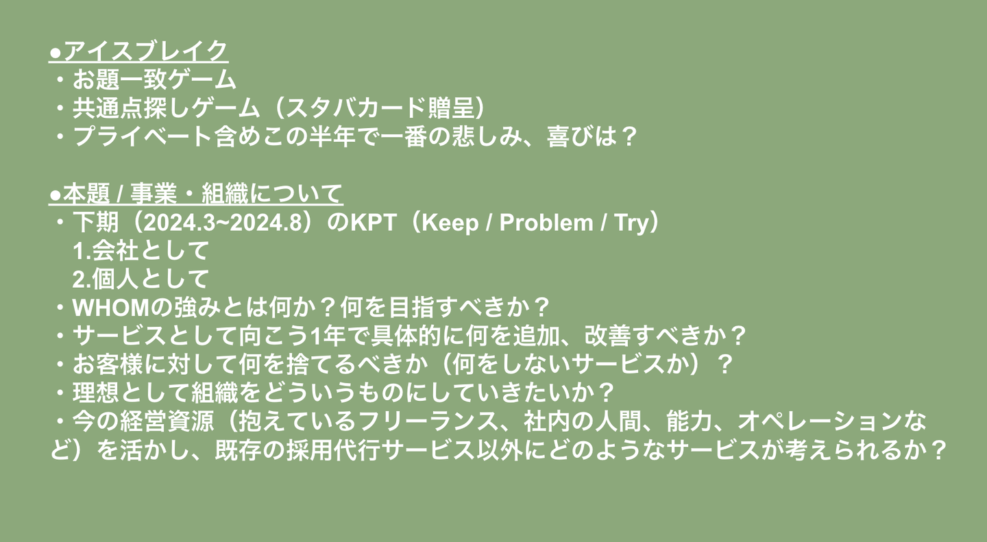 WHOMは基本的にリモート環境ですので(広島に住んでいるメンバーもおり)オフラインで顔を合わせるイベントが大切だと考えています。また2023年度の期末を迎えるタイミングでもありましたので、改めて来期以降の未来の話を全員が考え、共通認識を持てるイベントをしたいと思い企画しました。