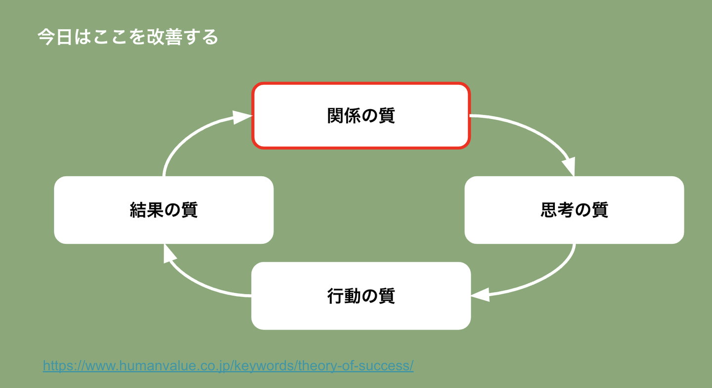 またMIT組織学習センター共同創始者のダニエル・キム氏によって提唱された「成功の循環(Theory of Success)」というモデルでは、下図のように組織の質を4つの分解し「関係の質」が高くなると他の質も高まるとされており、オフサイトではこの関係の質を向上させてたいと考え実施しました。