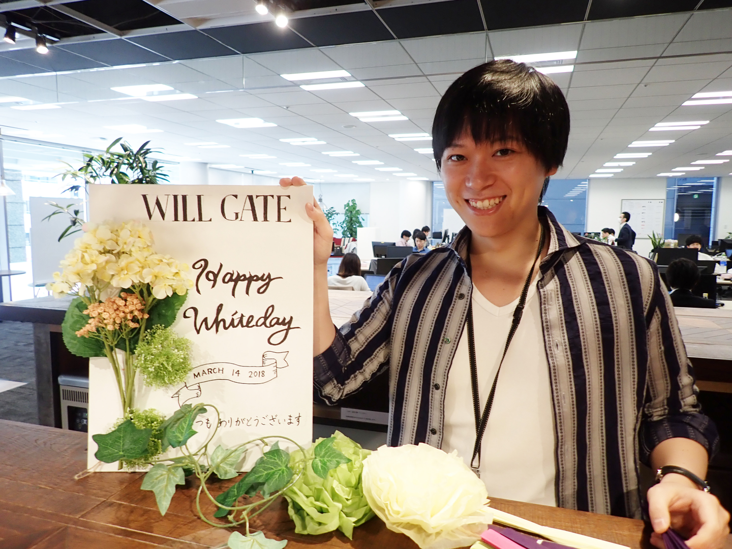 ウィルゲートのホワイトデーイベントは、役員陣がスタッフ。 女性社員への日ごろの感謝と、今後も輝き続けてほしいという願いを込めて行われています。