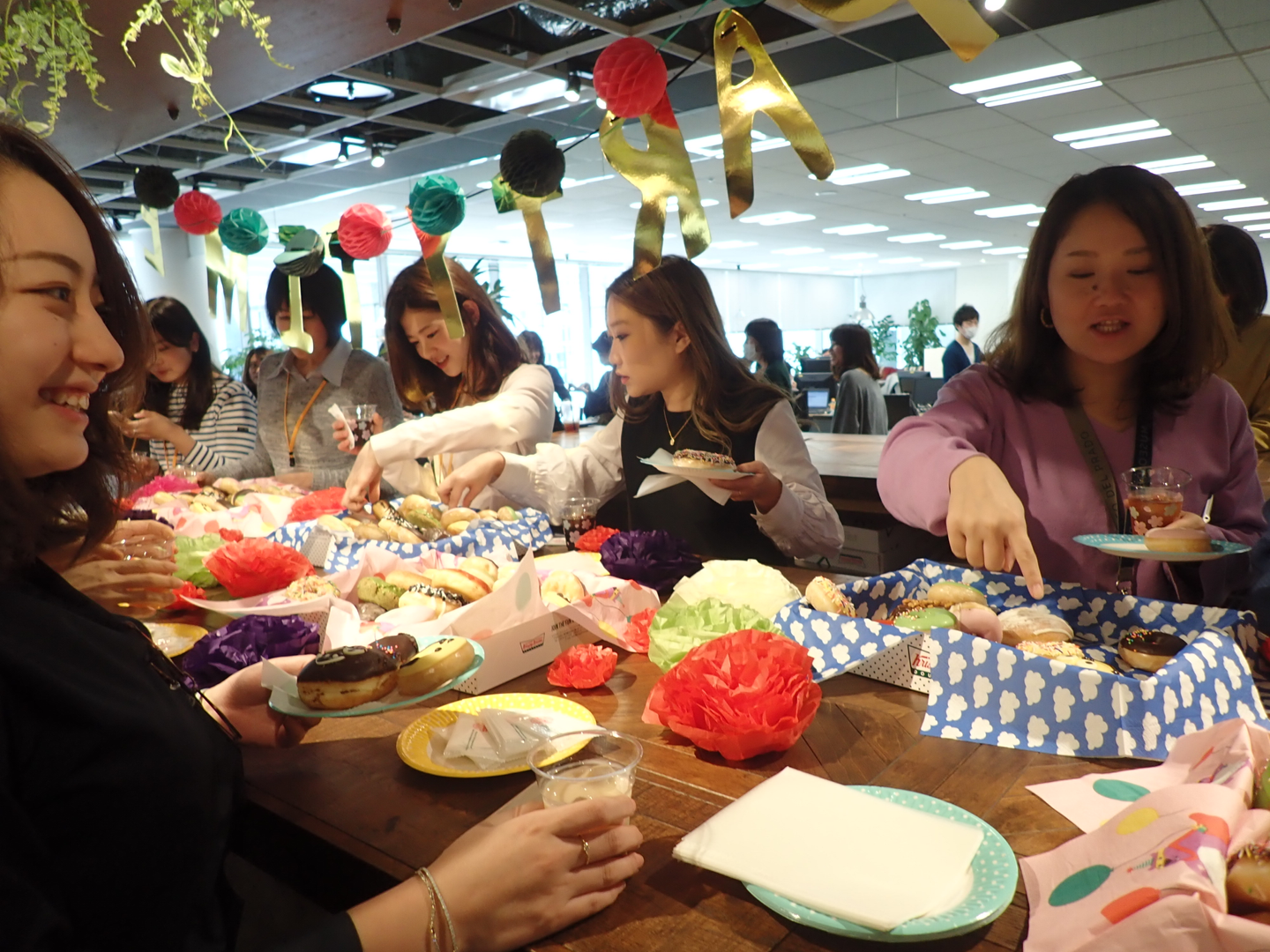 可愛らしいドーナツに、女性社員からは歓声があがり、どれを選ぼうかと迷ったり、スマホで撮影したりする姿が見られました。