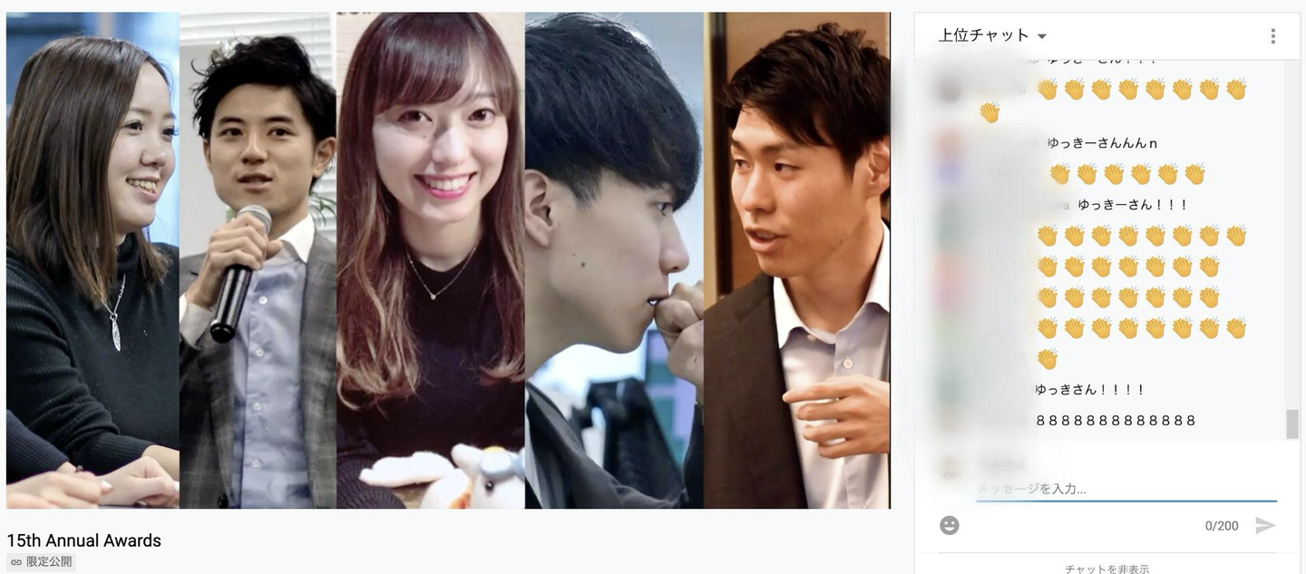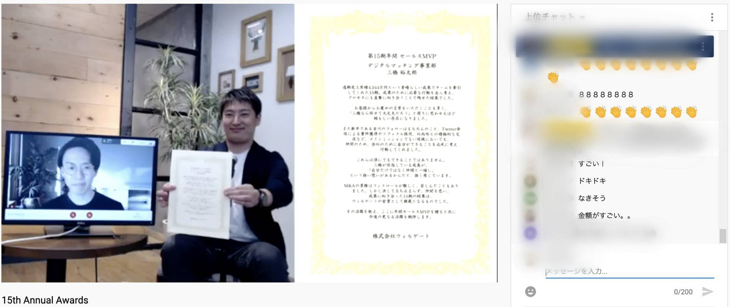 受賞者発表はYoutube配信で行われます!社員は配信を見ながら、チャット欄でのコメント・リアクションで盛り上げます。
