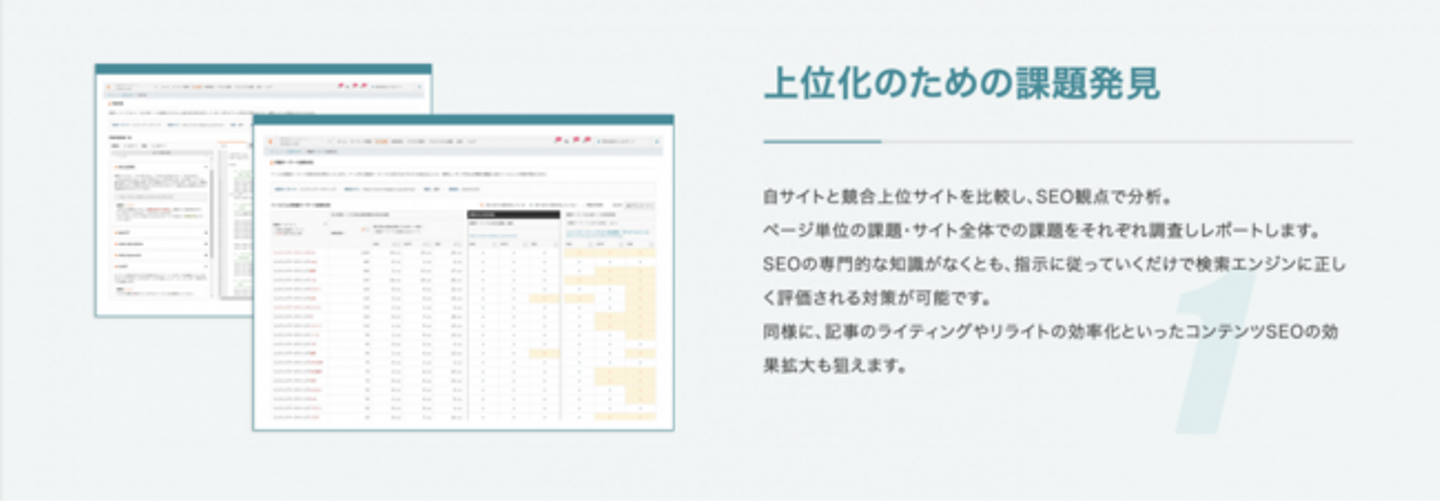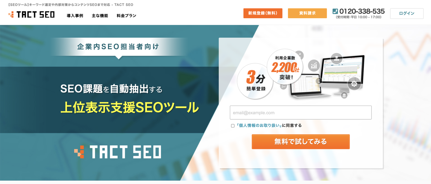 「TACT SEO」はウィルゲートが2,900社以上のSEOコンサルティングの知見をもとに開発した、狙ったキーワードで上位表示するためのSEOツールです。延べ2,200社(2021年7月1日時点)を超えるSEO対策に取り組む企業様にご利用いただいております。SEOに必要なキーワード調査からコンテンツの課題分析まで、調査を自動化し、作業を効率化することができます。SEO対策に関する業務全般をサポートすることで、コンテンツ集客力の向上に貢献します。