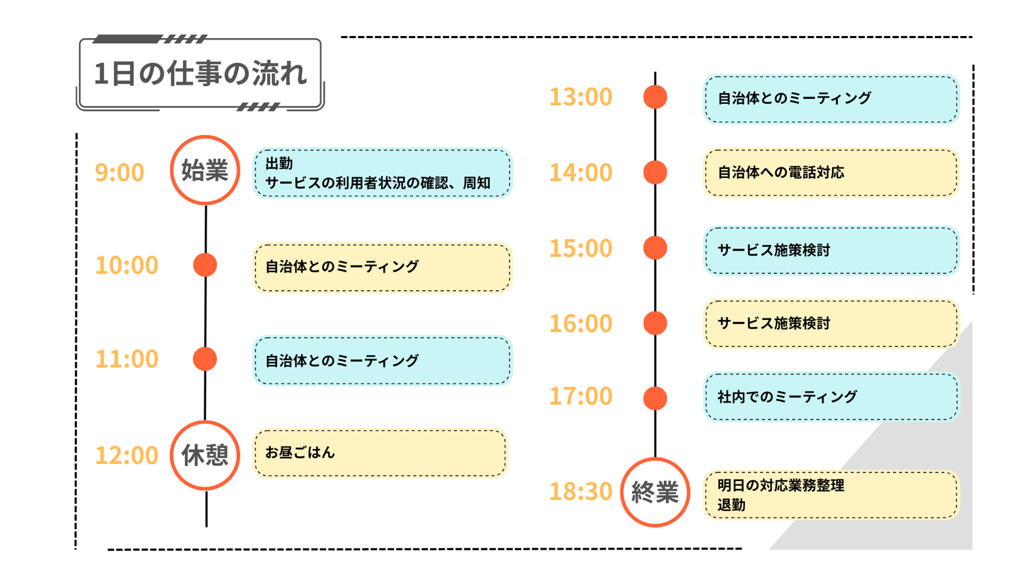 これは実際に当社で働く社員の、お仕事の流れになっています。 この1日の流れをもとに、もう少し深堀ながらご紹介していきます!