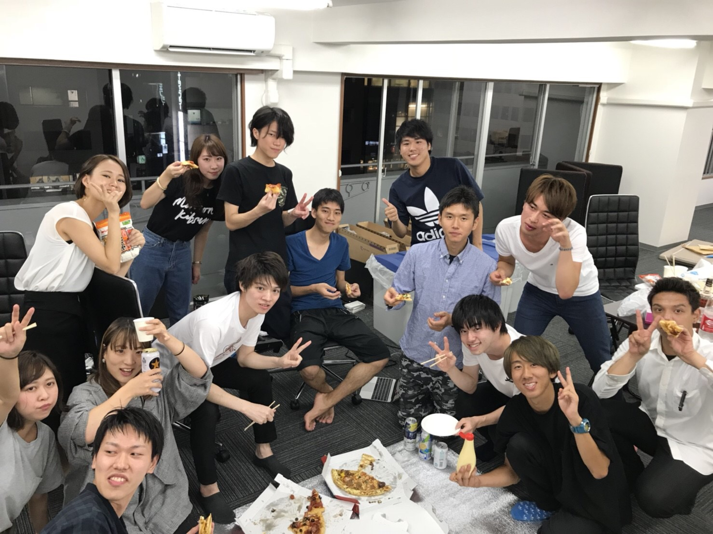 ピザとたこ焼きをメンバーとシェアして、移転をお祝いしました!