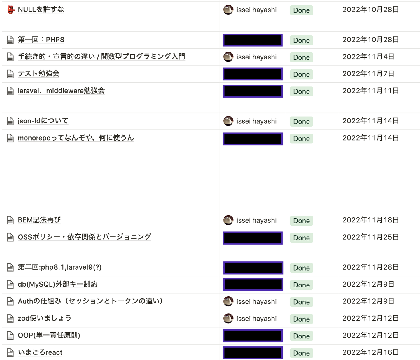 と、毎週様々なテーマで開かれており、メンバーの話を聞いたり、自分もアウトプットの場として発表しています。参加率もその日仕事をしている社員・インターン生は毎回ほぼ全員参加していただけています。
