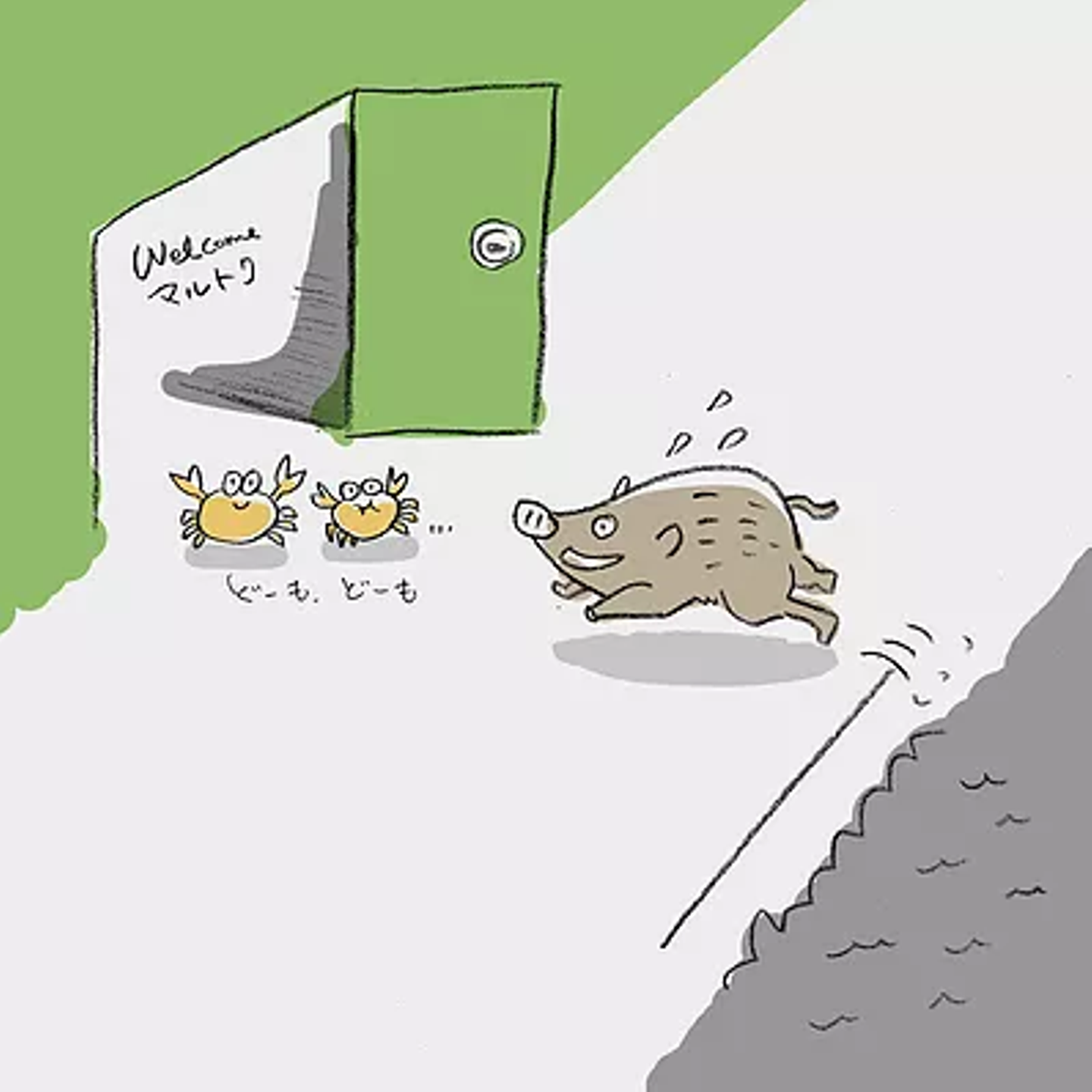 ここ数年はカニばかりか、イノシシが海からあがってくることも。瀬戸内海の島から泳ぎ渡ってくるようです。