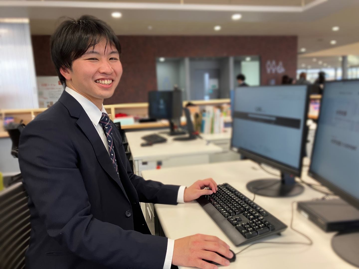 一番のやりがいは、やはり学生の成長に携われるところですかね。学生アルバイトの採用も僕たちの仕事で、書類の選考から面接まで担当します。現在の100名の学生アルバイトの中には、パソコンが得意な学生・苦手な学生と、本当にそれぞれなのですが、元々は僕よりも苦手だった学生が、短期間でソコンの知識をたくさんつけていることもあり、いい刺激をもらっています。