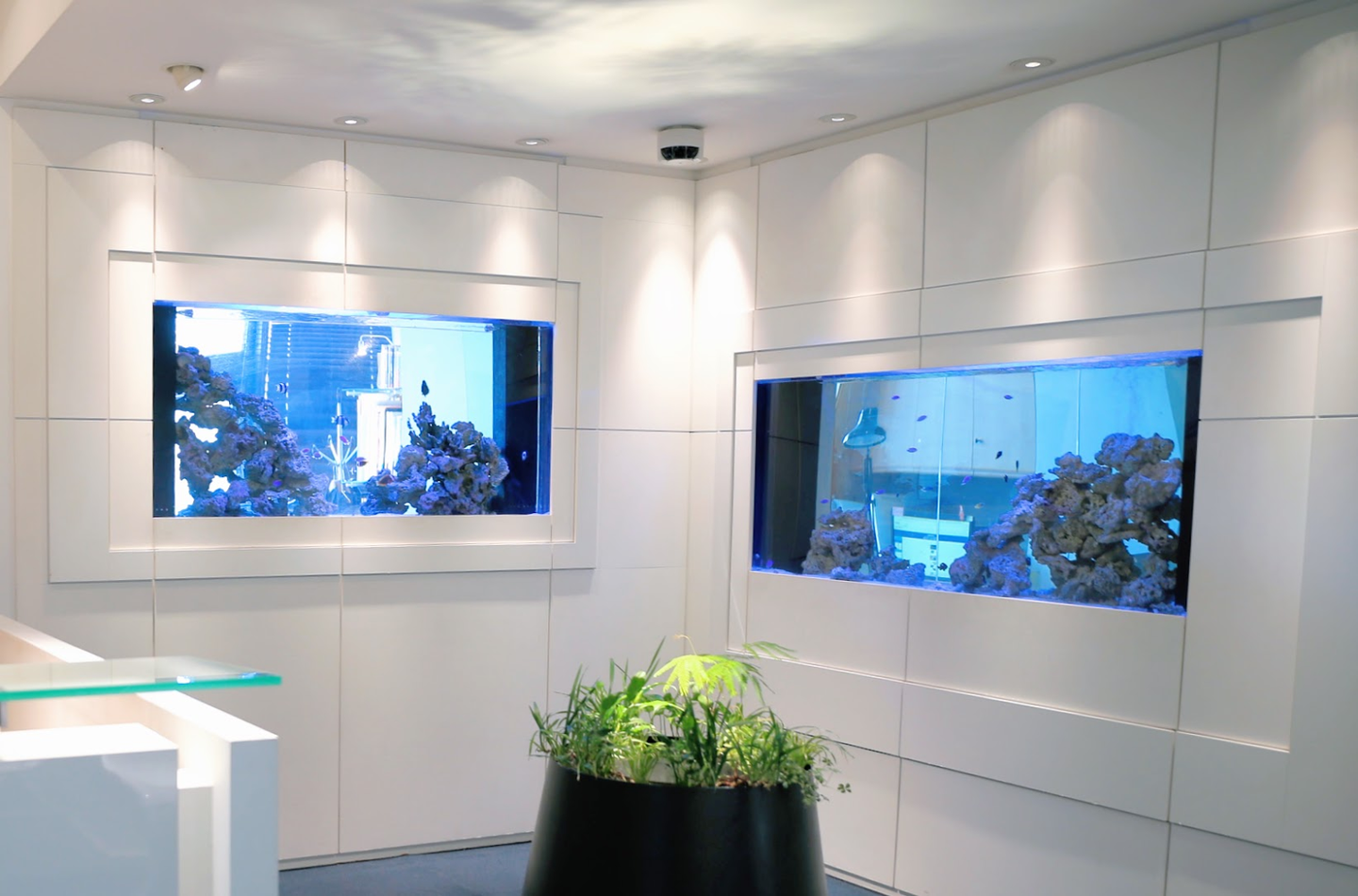 真ん中に水を貯められるようになっており、下からライトを当てて天井に水面を表現しています。オブジェの中には様々な種類のグリーンを配置しています。エントランス全体で「水と光と緑」をテーマにしており、自然を感じられる空間にしています!