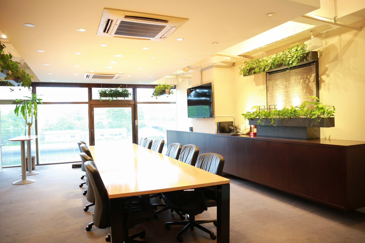 こちらはワークスメディアの会議室です。窓際、両壁、見渡す限りグリーンを置いています!入って右手には、オリジナル商品である滝のオブジェがあります。この部屋は照明も暖色の物を使用しており、会議室特有の堅苦しい雰囲気を無くしています。