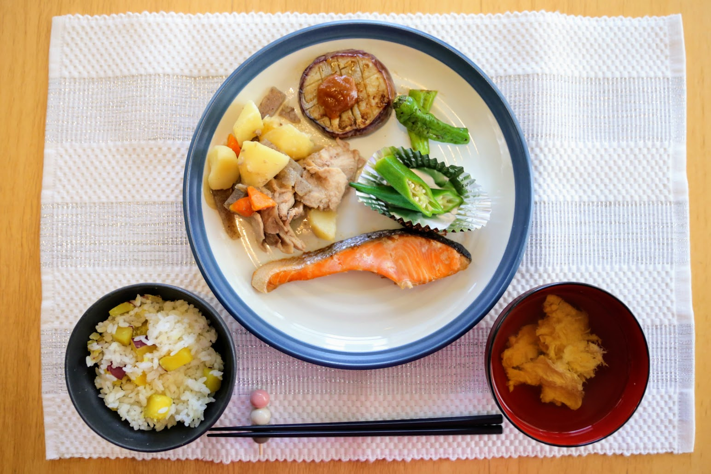 焼き鮭、肉じゃが、なす田楽、焼きししとうなどたくさんの副菜が嬉しい定食!ご飯がさつまいもご飯になっていることに感動しました(笑)定食屋さん顔負けの美味しさとボリュームで、これが300円なんて嬉しい限りです!