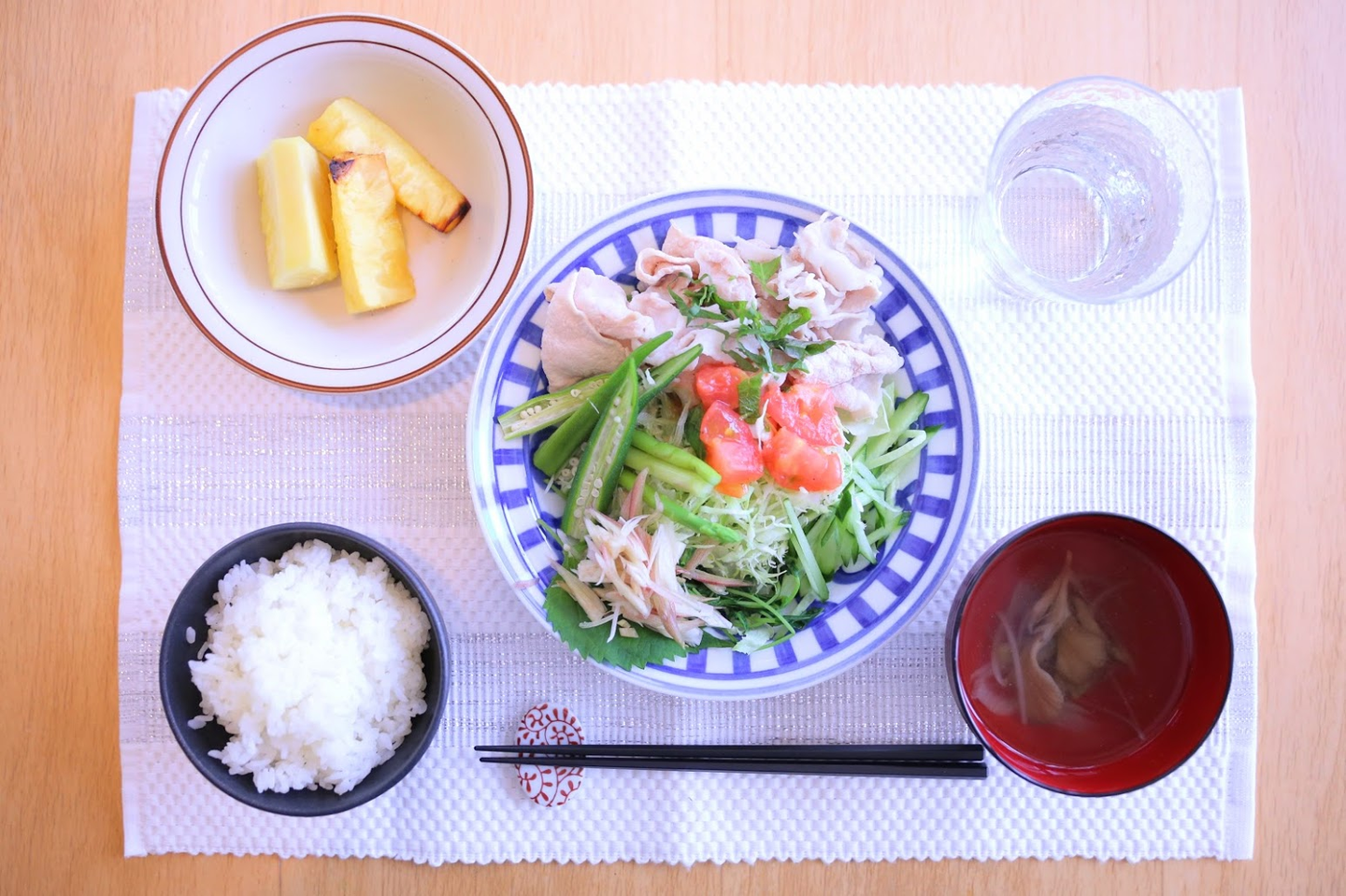 夏メニューです!豚しゃぶの下にはたっぷりの野菜が敷き詰められています。さっぱりメニューですが、たっぷりの野菜が一緒なので、おなかいっぱいになりました!