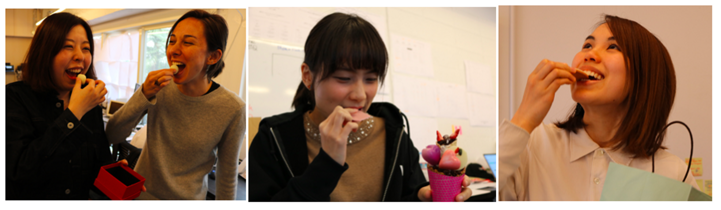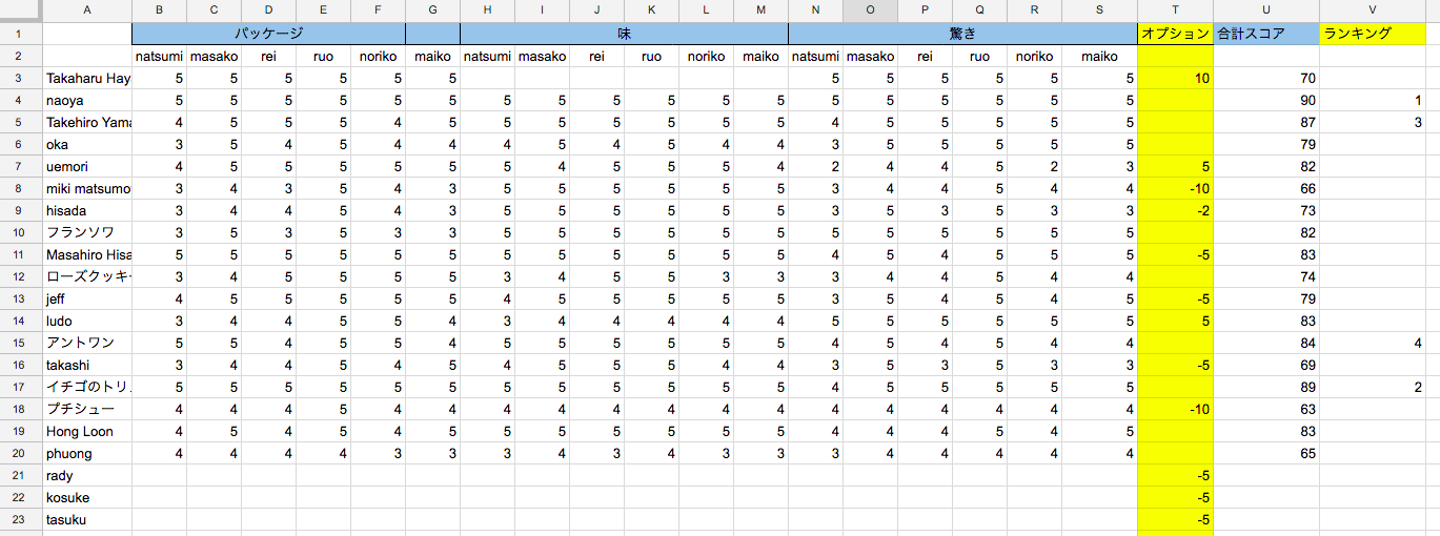 スコアシートには前回同様、「パッケージの可愛さ」・「味」・「意外性・驚き」の3つの項目を設け、女性社員6人がそれぞれ5点満点で採点していきます。