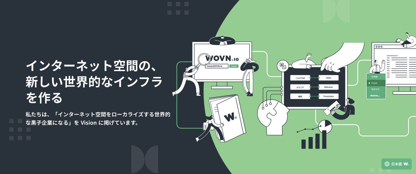 主力製品の WOVN.io は、Web サイトやモバイルアプリの多言語運用を自動化・効率化する SaaS で、翻訳品質の適正化、多言語システムの開発・運用にかかるコストや人的工数の削減を実現します。海外戦略・訪日インバウンド・在留外国人対応を推進したい大手企業・グローバル企業に多数、ご利用いただいております。