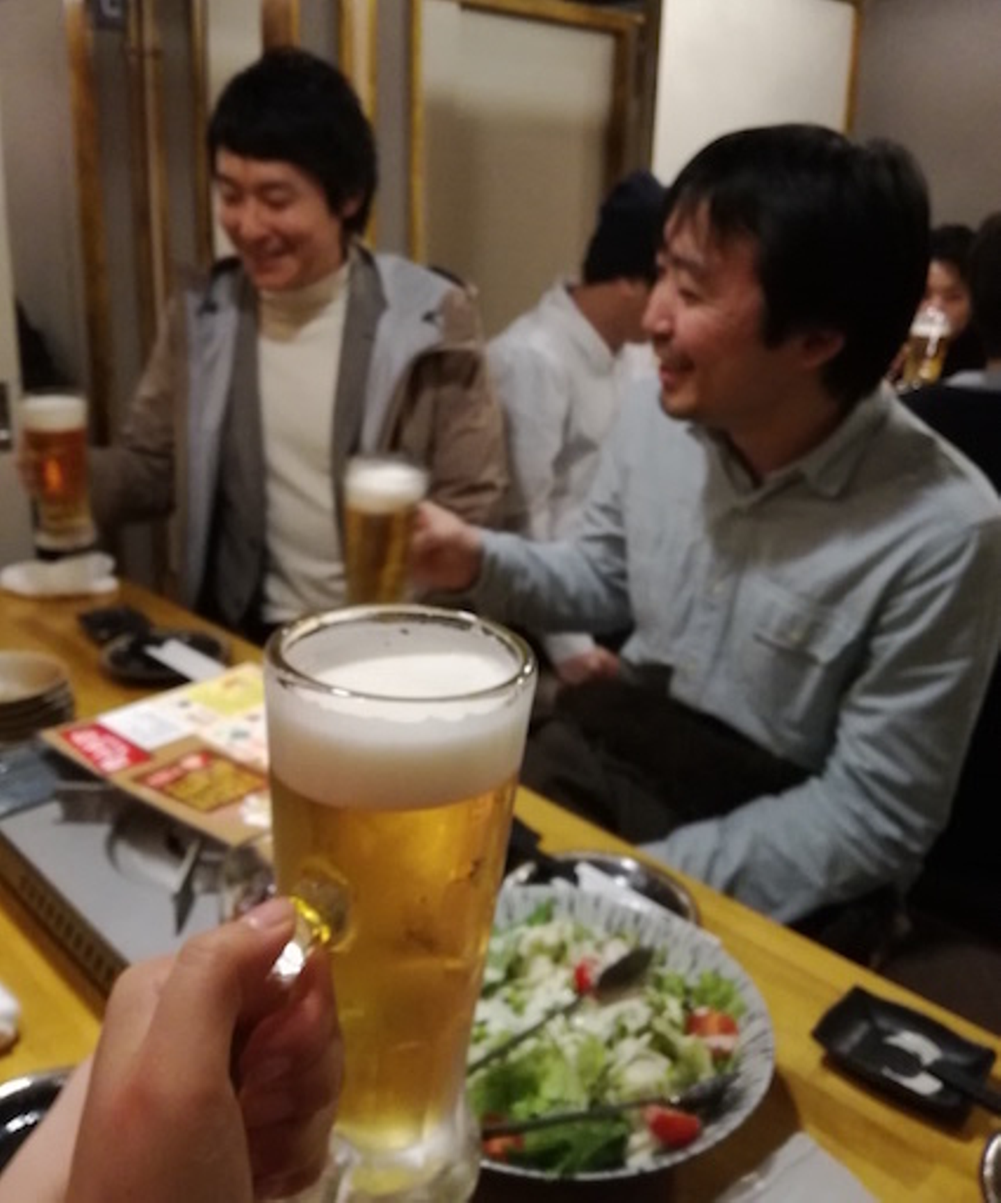 (乾杯の図。左:一応主役の山本さん、右:頼れる父ちゃん井内さん)