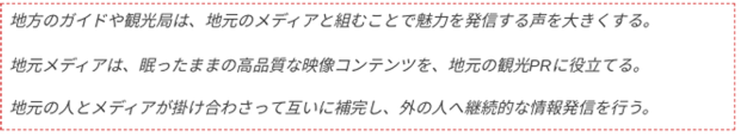 地元の人・地元のメディアが力を持って、地元の魅力を発信することでより声を大きくし、これまで届かなかった外の人達にしっかりとに届ける。その声を実際に聞いて来てくれた旅行者や外から来る人に繋がり、更にその地域に来た人が繋がる。自発的に情報が広がっていくというイメージです。また、国内だけだとお金の流出にならないので、インバウンド(訪日外国人旅行客)へ届くことも大切です。