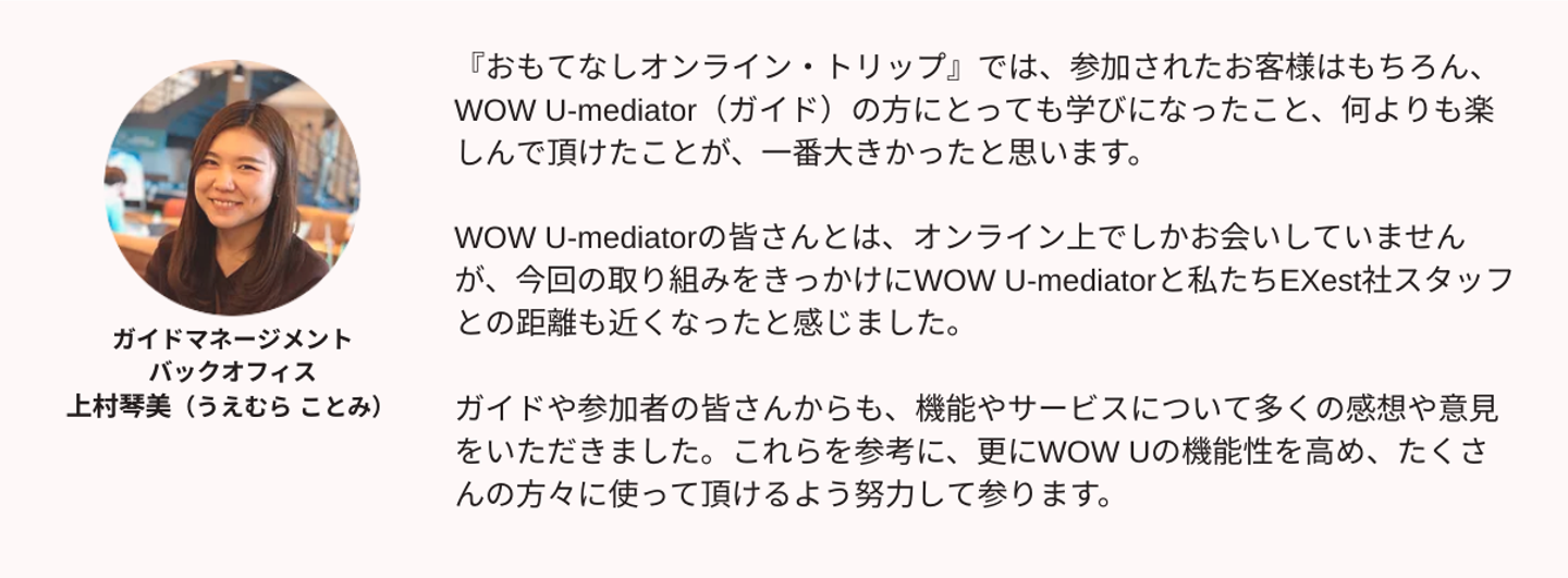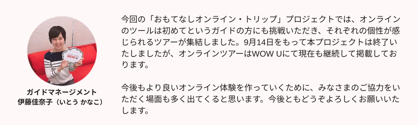 このような状況を受け、EXest社は、日本全国の通訳案内士団体と連携し、訪日外国人向けに「おもてなしオンライン・トリップ」を企画。7月15日(木)にリリースいたしました。その後、9月14日(火)に、約2ヶ月間に渡り実施した『おもてなしオンライン・トリップ』の開催が終了いたしました。