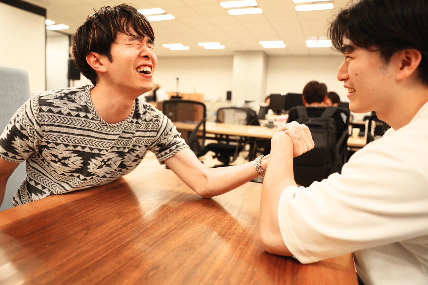 日置さん「間違いなく『人』ですね。オフィス見学の時に、社内に音楽が流れていて、みんなが活発に会話している雰囲気がすごく良くて。でも何より、自分の上司になる方と話したいとお願いして面談させてもらった、木戸さん(現・開発部部長)の存在が大きかったです。」