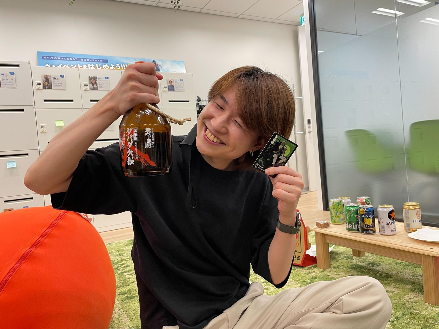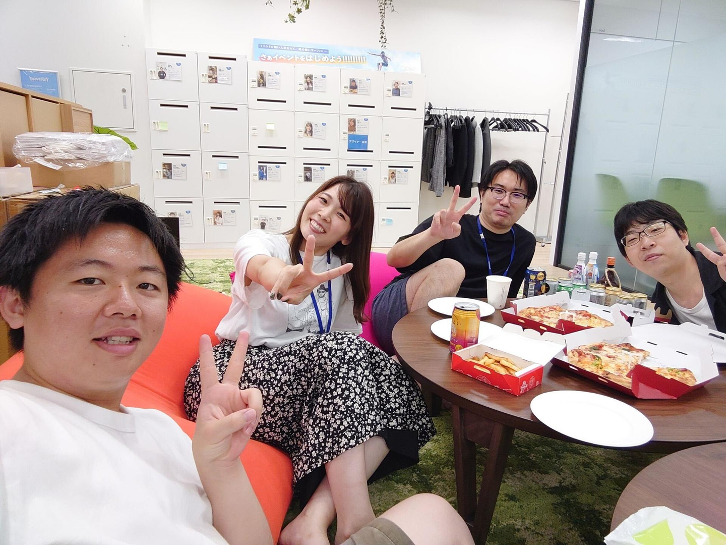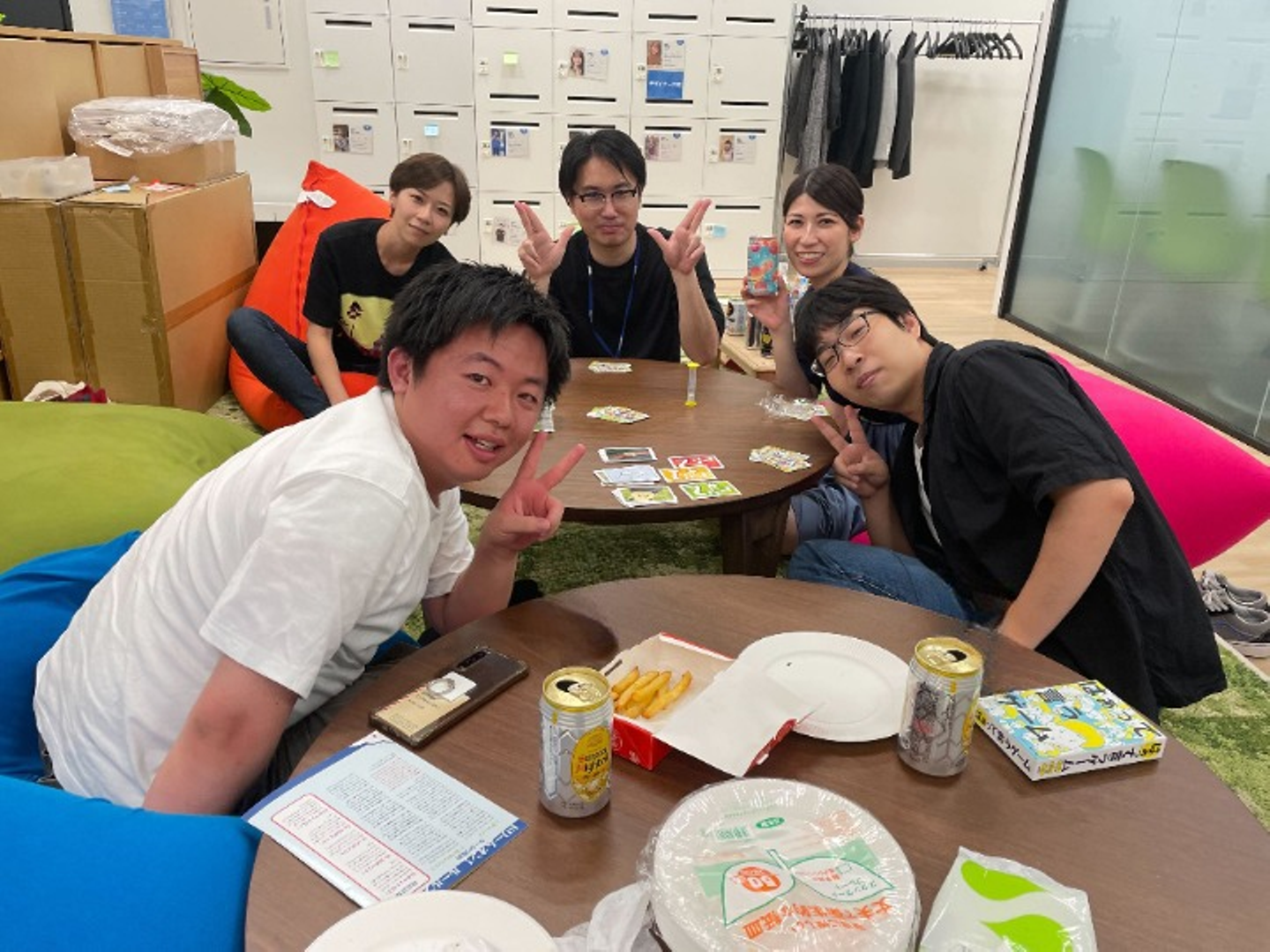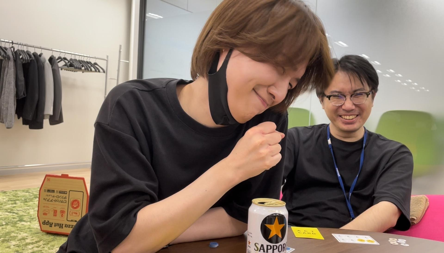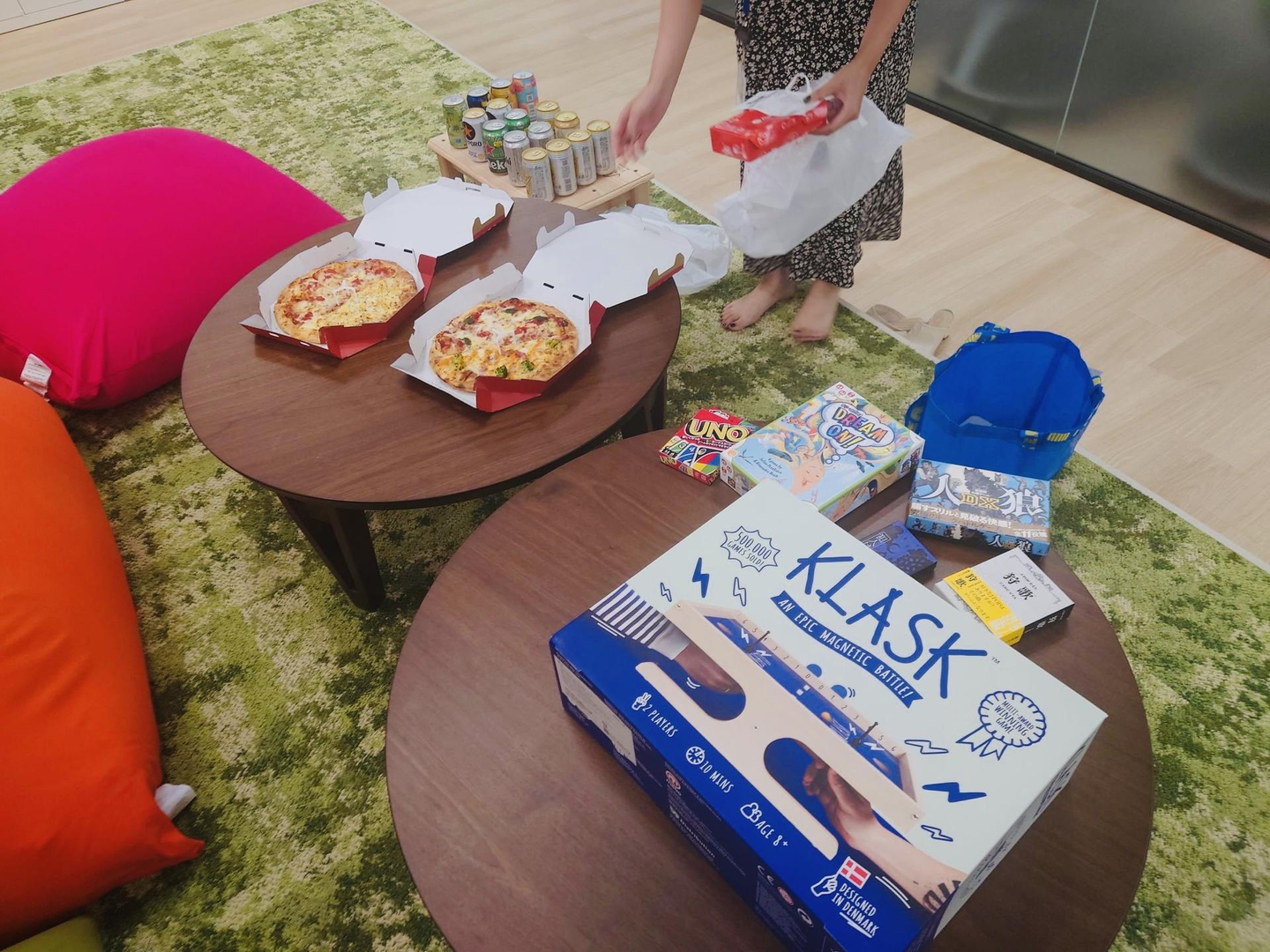 いそいそと仕事を終え、お酒とピザを注文!🍻🍕 みんなを迎え入れる準備を始めます! 持参したボードゲームを並べて、出社しているメンバーに「遊びましょ〜」と声をかけ招集!😋