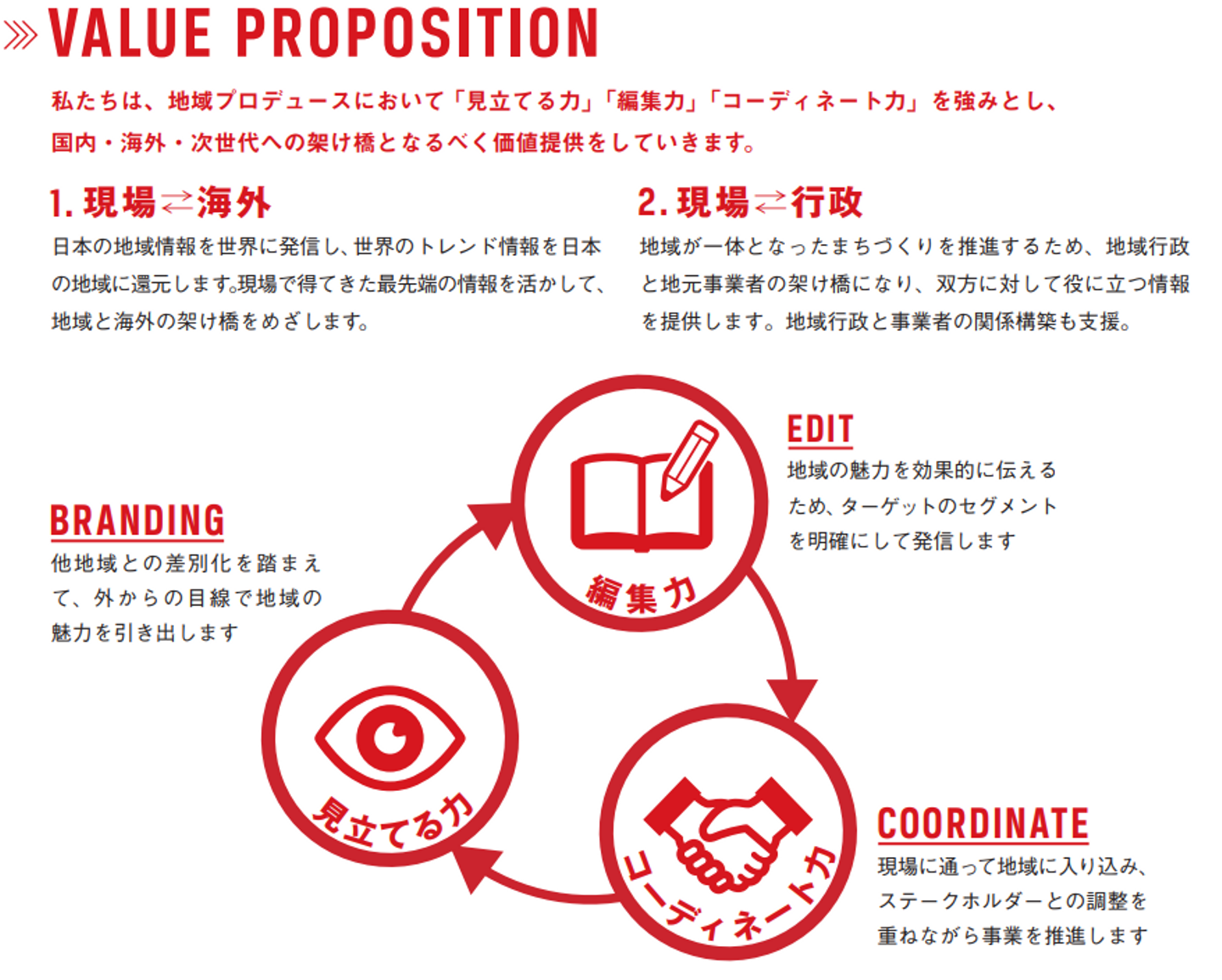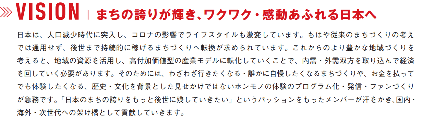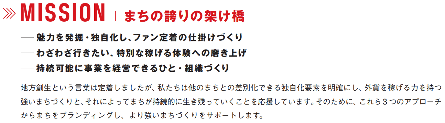 「地域の資源をどう活かすかの編集力、見たてる力(ブランディング)、コーディネート力」という強みをもとに地域観光を外から、コンサルティングサポートしています。